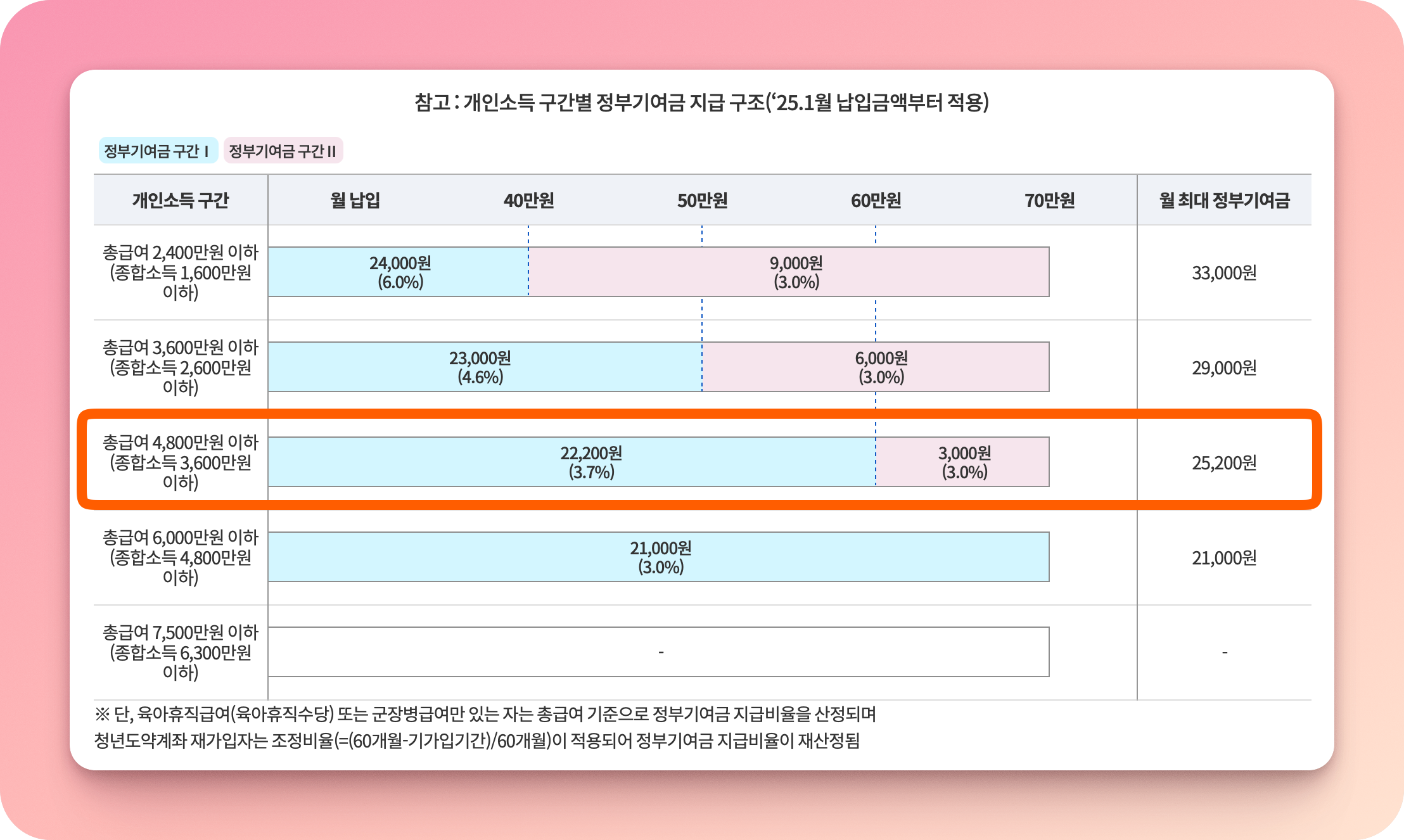 - 1년 주기로 개인소득을 확인해서 정부기여금 지급비율을 결정한다. 그리고 이걸 1년간 적용한다.
