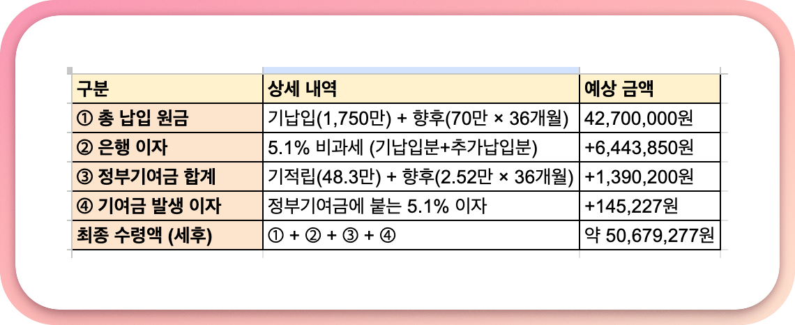 5년만기까지 월 최대 70만원을 계속 납입할 경우 최종 원금은 4,270만원 정도된다. 여기에 연 이자 5.1%를 적용받게되면 이자는 대략 640만원 정도다. 그리고 정부기여금 5년 합계가 약 140만원 정도 붙게되고 정부기여금에 다시 붙는 이자는 대략 14만원 정도된다. 이렇게해서 원금과 이자를 합한 금액은 약 5000만원 정도 세후 수령이 가능해진다.