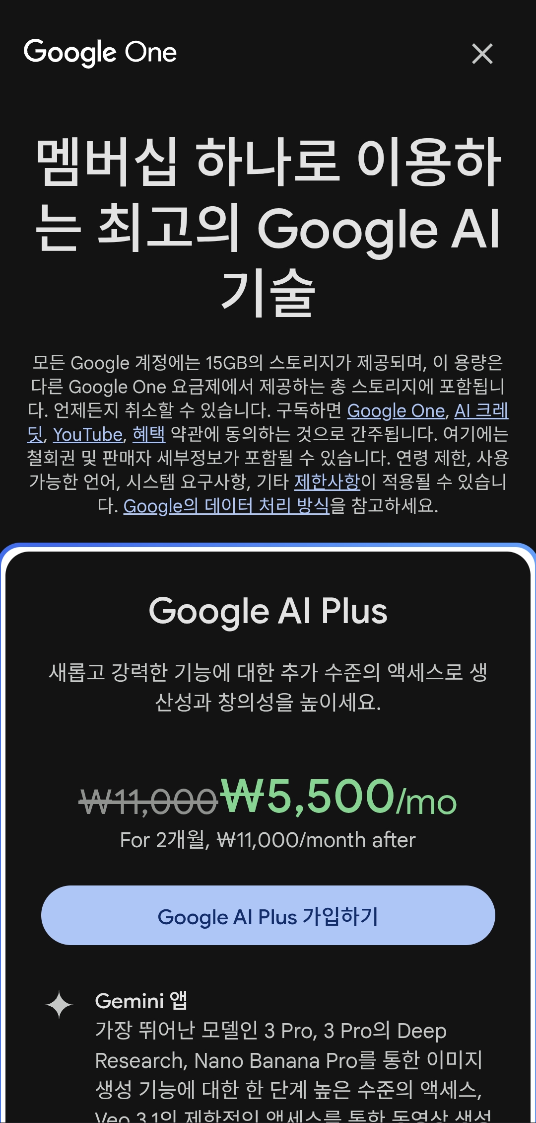 그나마 좋은점이라면 이번에 구글 AI 에서 제미나이 AI PLUS 요금제를 출시하면서 출시 이벤트로 2개월동안은 월 5500원으로 반값 할인해준다는거 ㅋㅋ 개이득인 부분이다. 처음에 이 이벤트는 계정당 1번이며 지금까지 구글 AI에 가입하지 않았던 사람만 쓸 수 있다고 알려져있는데 내가 직접 해보니까 그렇지 않았다. 기존에 구글 제미나이 유료를 썼었던 사람도 다시 AI PLUS를 이용할 수 있었다. 아마 이 부분은 사용자 계정마다 조금 다르게 적용되는 모양이다. 암튼 나는 되었다.