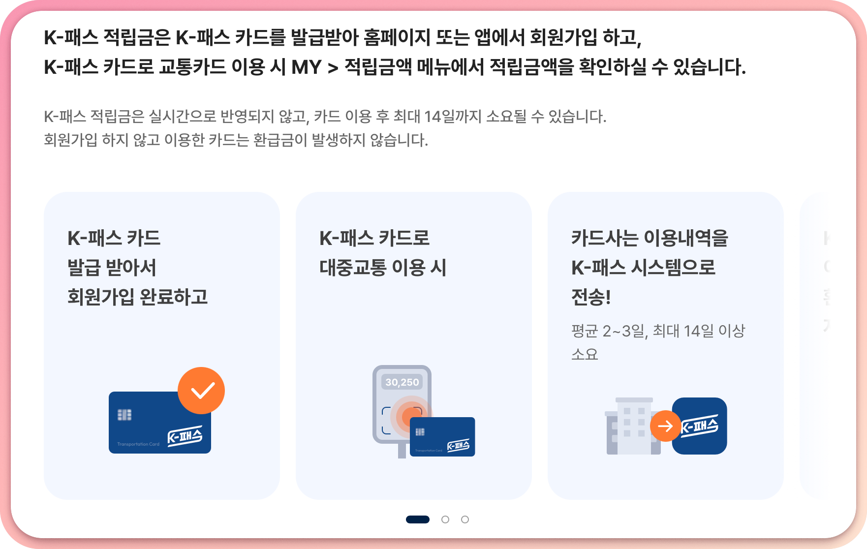 별다른 액티브X 따위 필요없이 맥북에서도 문제없이 잘 진행되었다. K-패스 적립금은 실시간 반영은 아니고 최대 14일까지 소요될 수 있기 때문에 넉넉하게 확인해보면 될 것 같다. 회원가입 안하고 카드 이용하면 환급금 안주니까 꼭 회원가입을 제일 마지막에 해주어야한다.