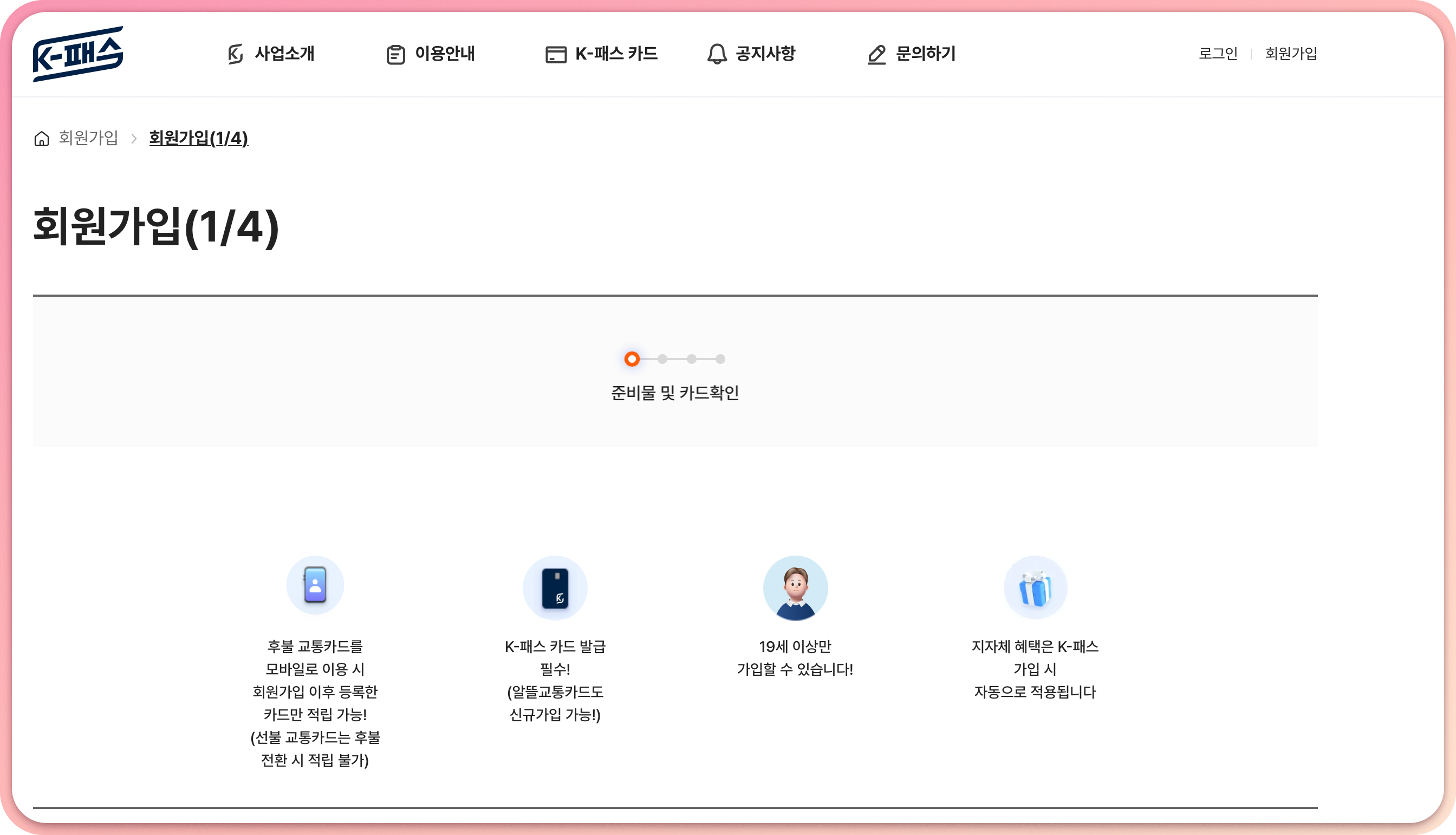 일단 K-패스 홈페이지에 들어가서 회원가입을 진행해야한다. 회원가입 이후 등록한 카드만 적립이 가능하기 때문에 반드시 회원가입과 카드 등록을 해주어야한다.