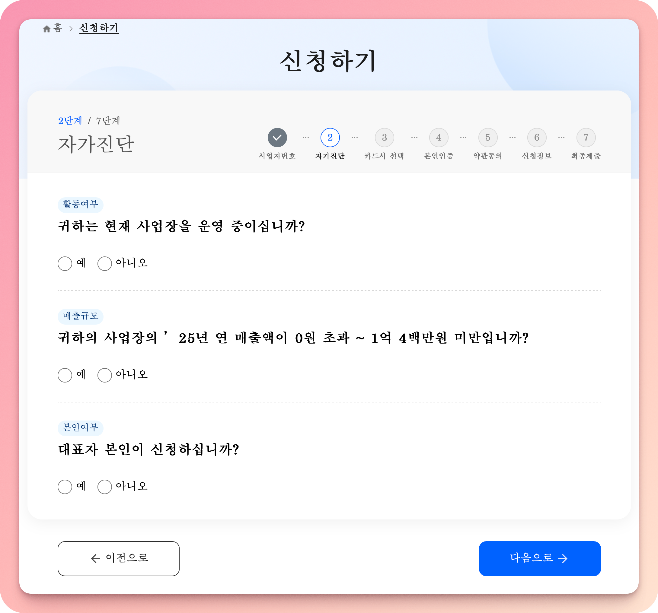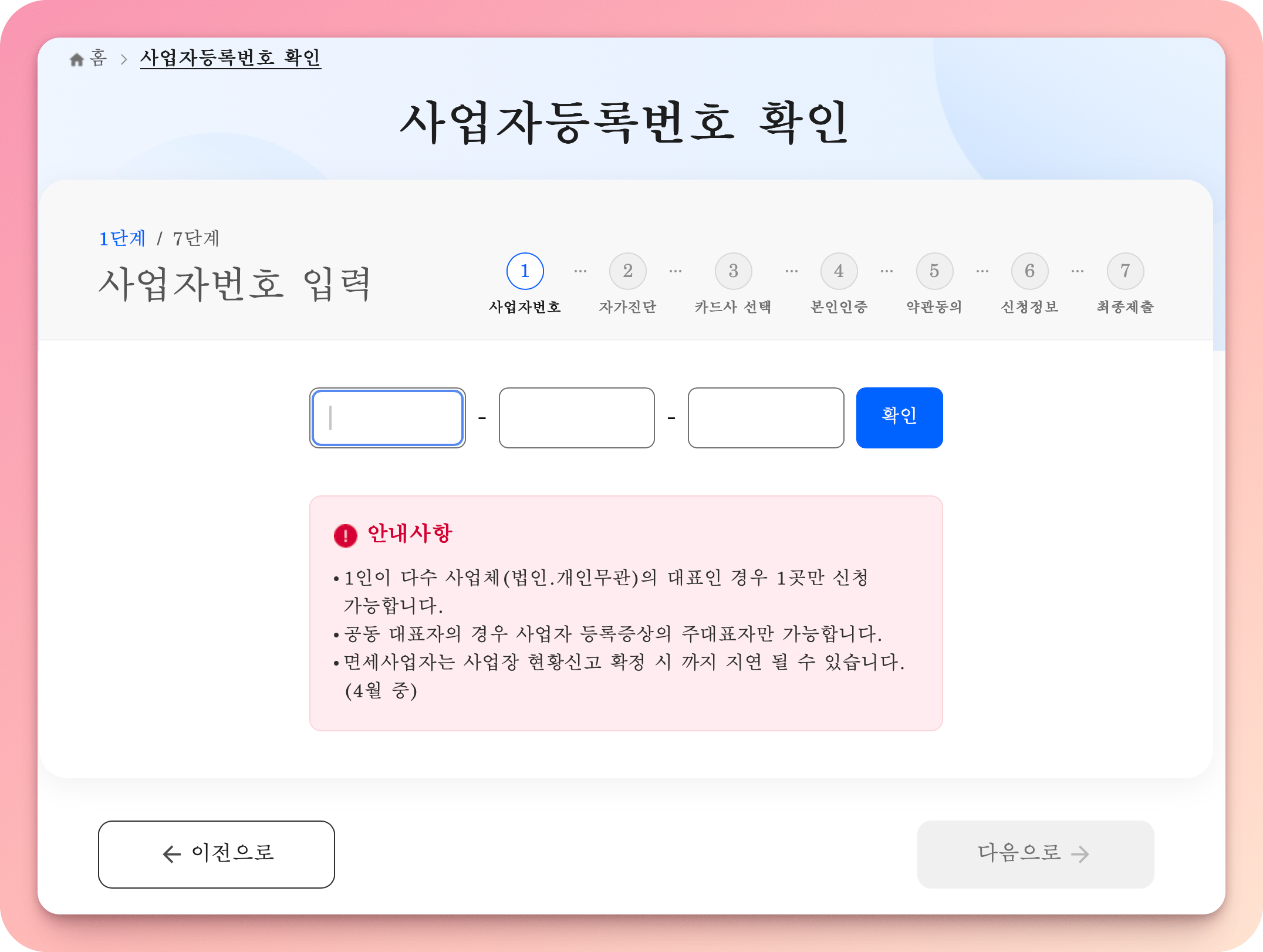 사업자등록번호 입력하고 조회한 후 신청 시작한다.