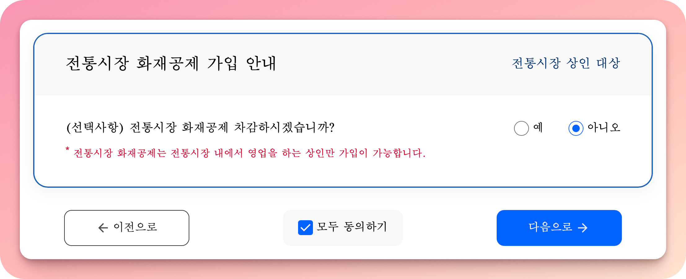 계속 진행하다가보면 전통시장 화재공제 강비 안내가 있는데 이 부분은 해당하는 사람만 선택하는 것이다.