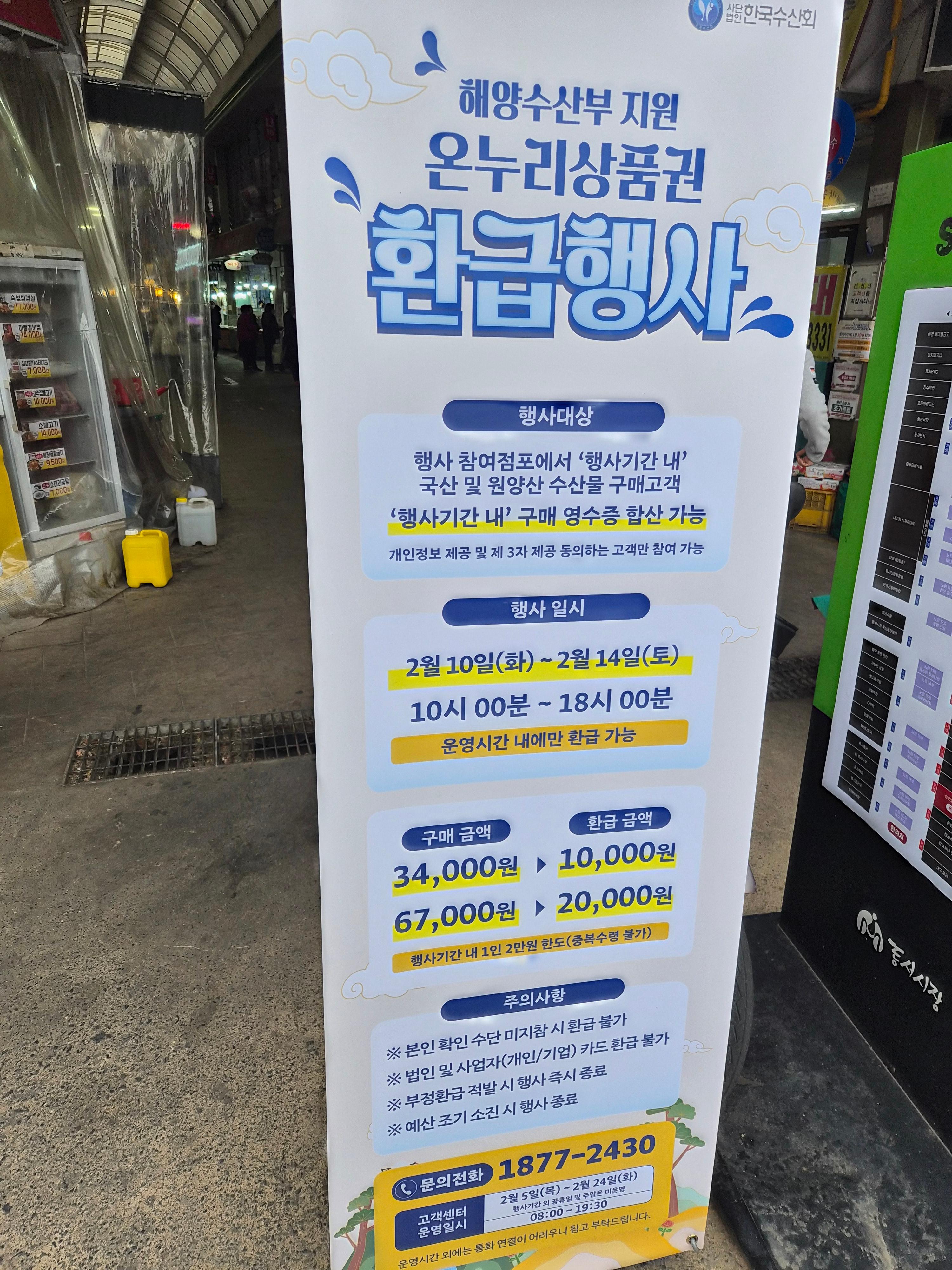 작년에는 이 행사는 없었던 것 같은데 올해는 수산물쪽도 행사가 있었다. 축산물쪽이랑 동시에 되는건지는 잘 모르겠고 안나와있다. 아무튼 수산물쪽도 똑같은 온누리환급 행사가 진행 중이다.