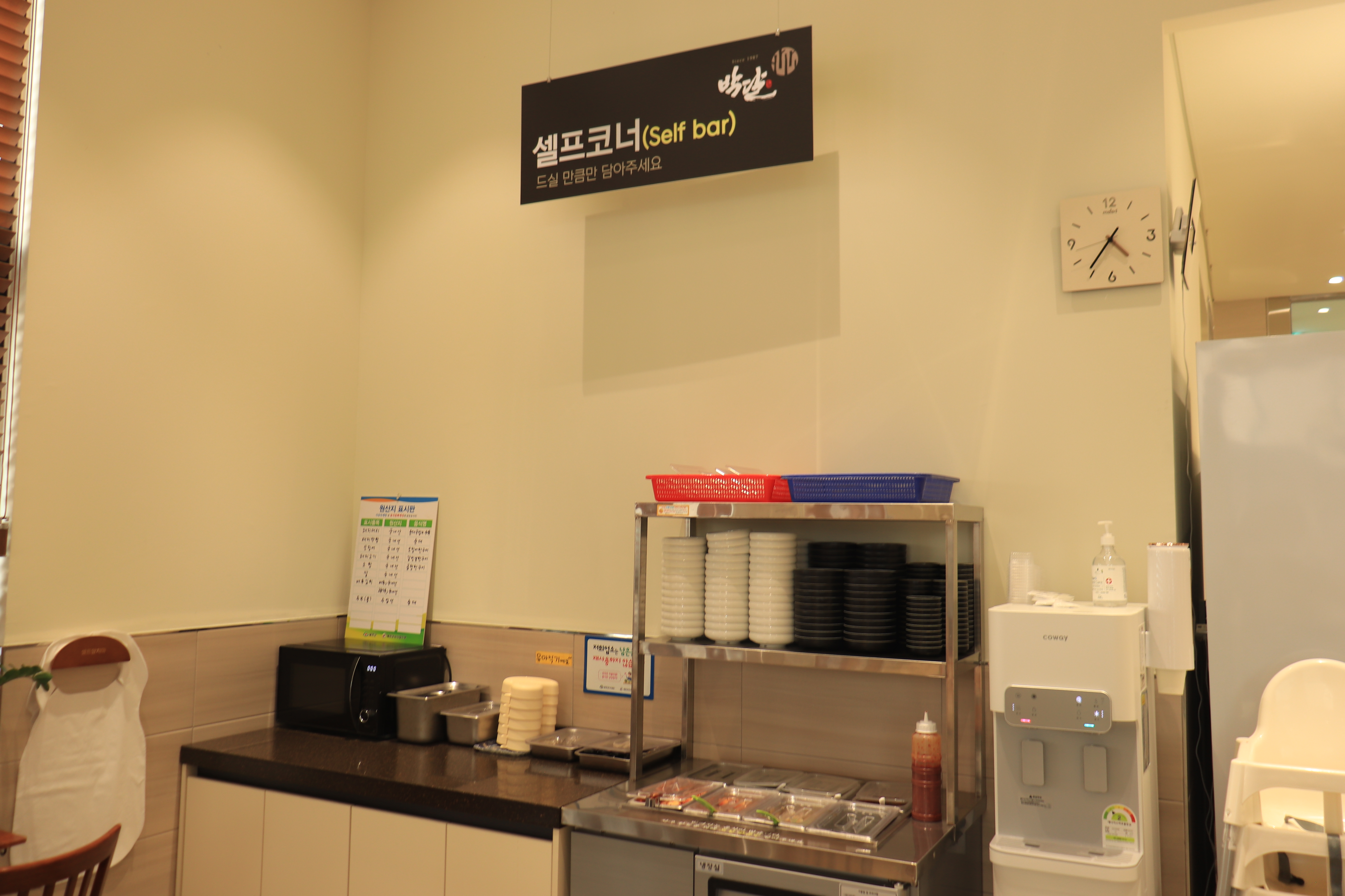 식당 한 켠에 있는 셀프코너에 가게되면 김치, 양파 등을 자유롭게 이용할 수 있습니다.