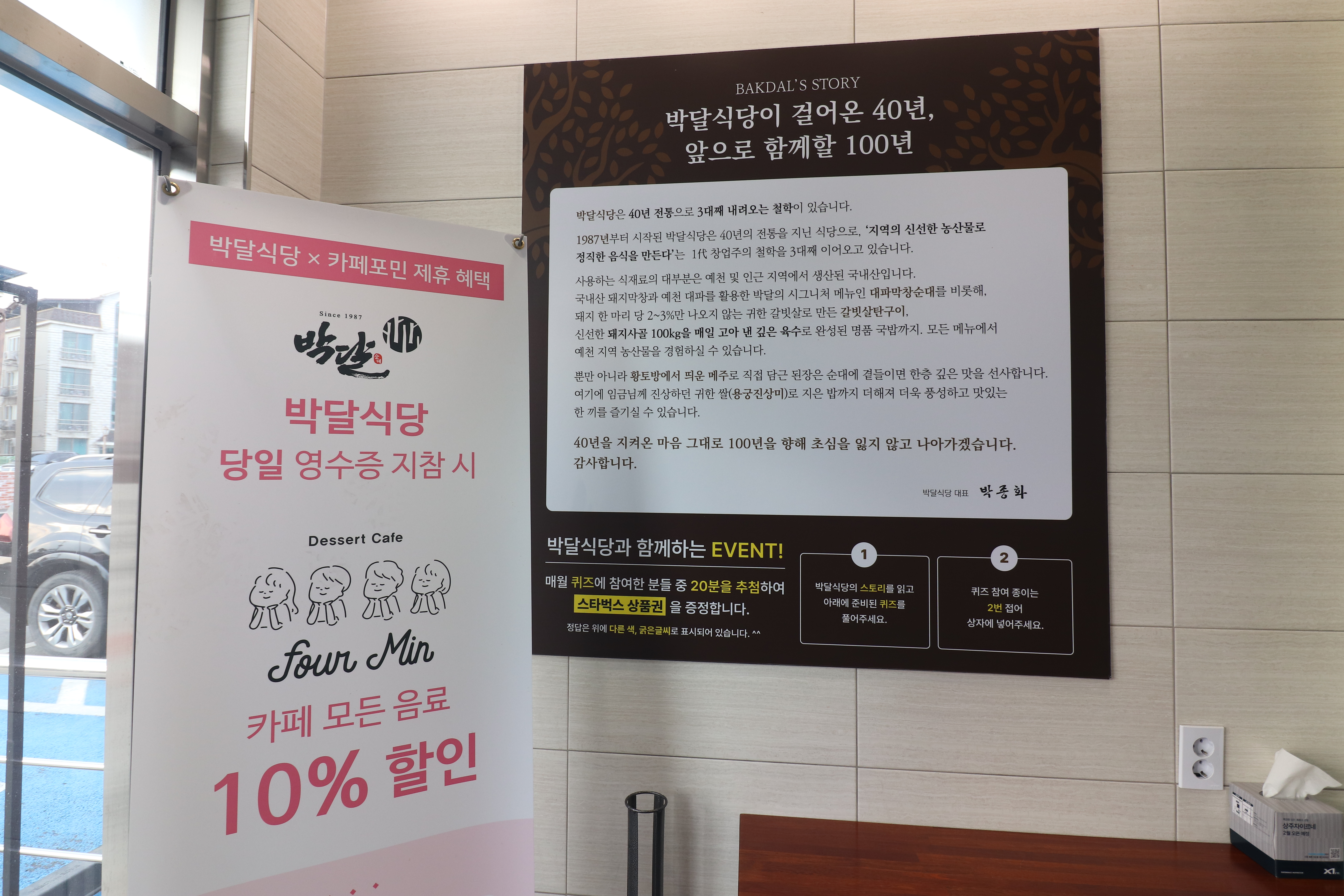 박달식당에 맛있는 예천 순대를 즐길 수 있는 메뉴들이 있습니다. 시그니처 대표메뉴는 박달국밥이며 막창순대, 갈비살탄구이, 오징어탄구이, 곱창탄구이 등 곁들임메뉴들도 인기가 많습니다. 예천 카페 포민과 제휴 혜택으로 카페 모든 음료를 10% 할인해주는 이벤트도 있어서 식사 후 예천 카페 포민에서 커피나 음료로 디저트를 즐겨봐도 좋을 것 같아요.