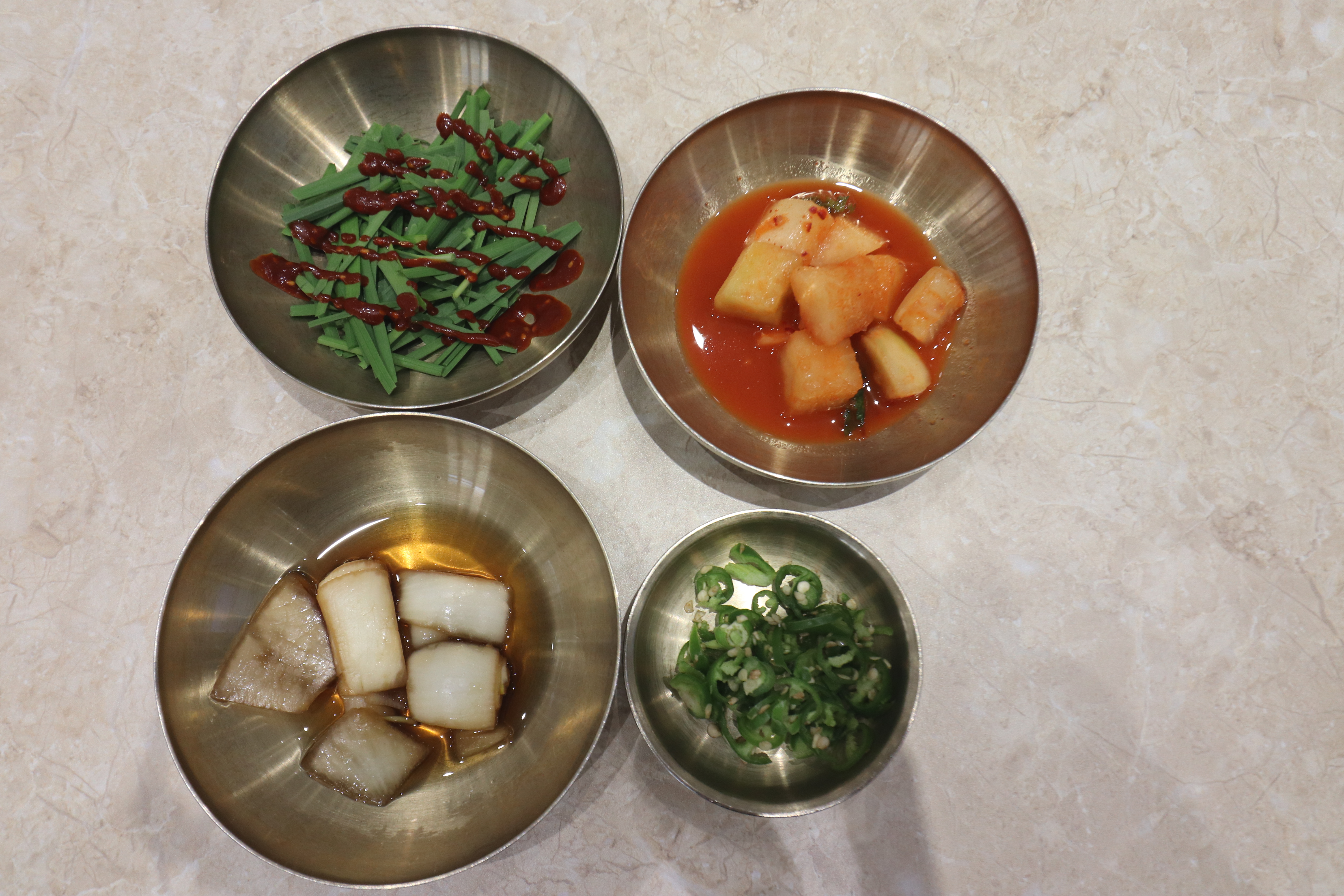 주문 후 먼저 밑반찬부터 받았습니다. 간략하게 나오는 편이며 나중에 셀프바를 자유롭게 이용할 수 있어서 좋았습니다.