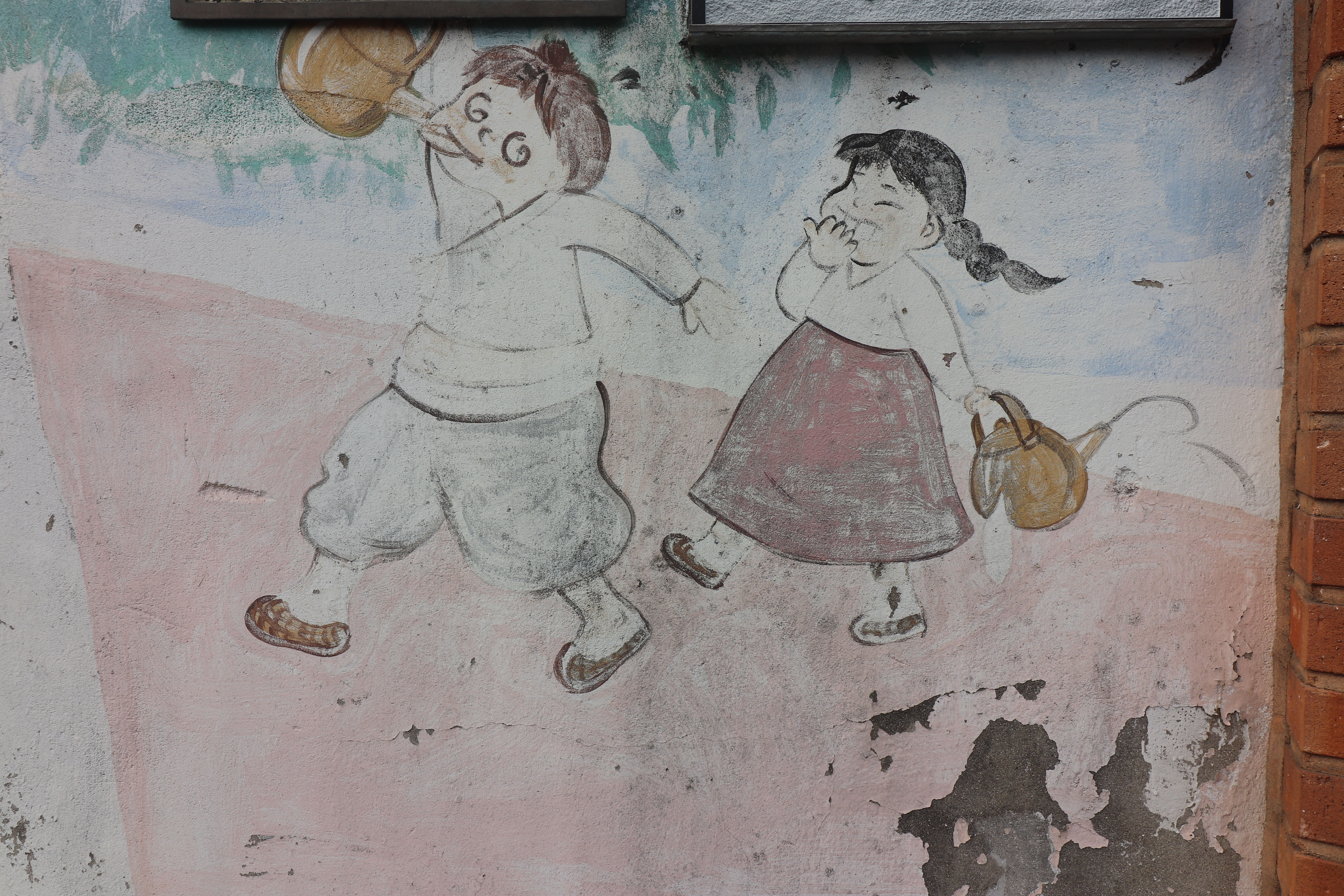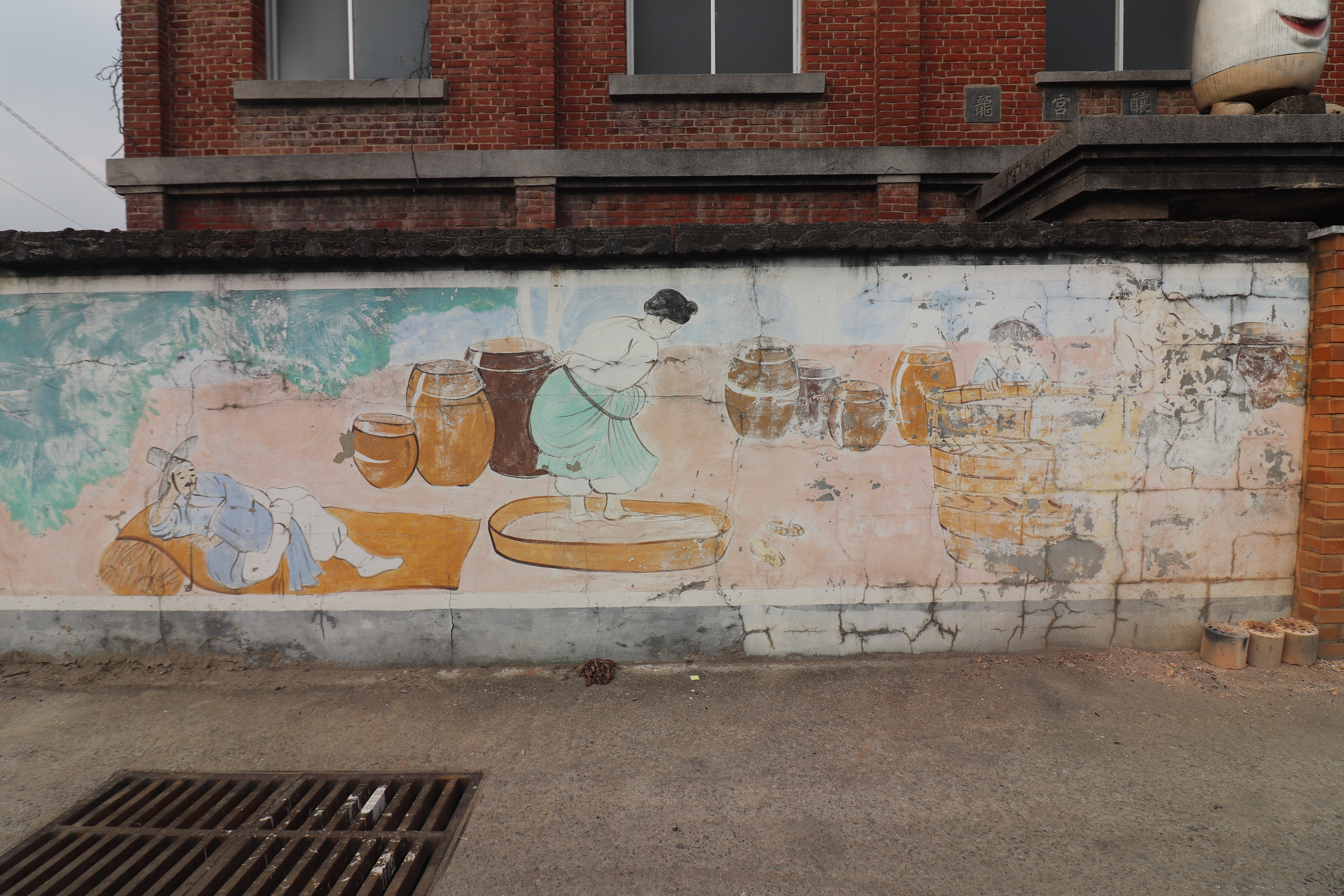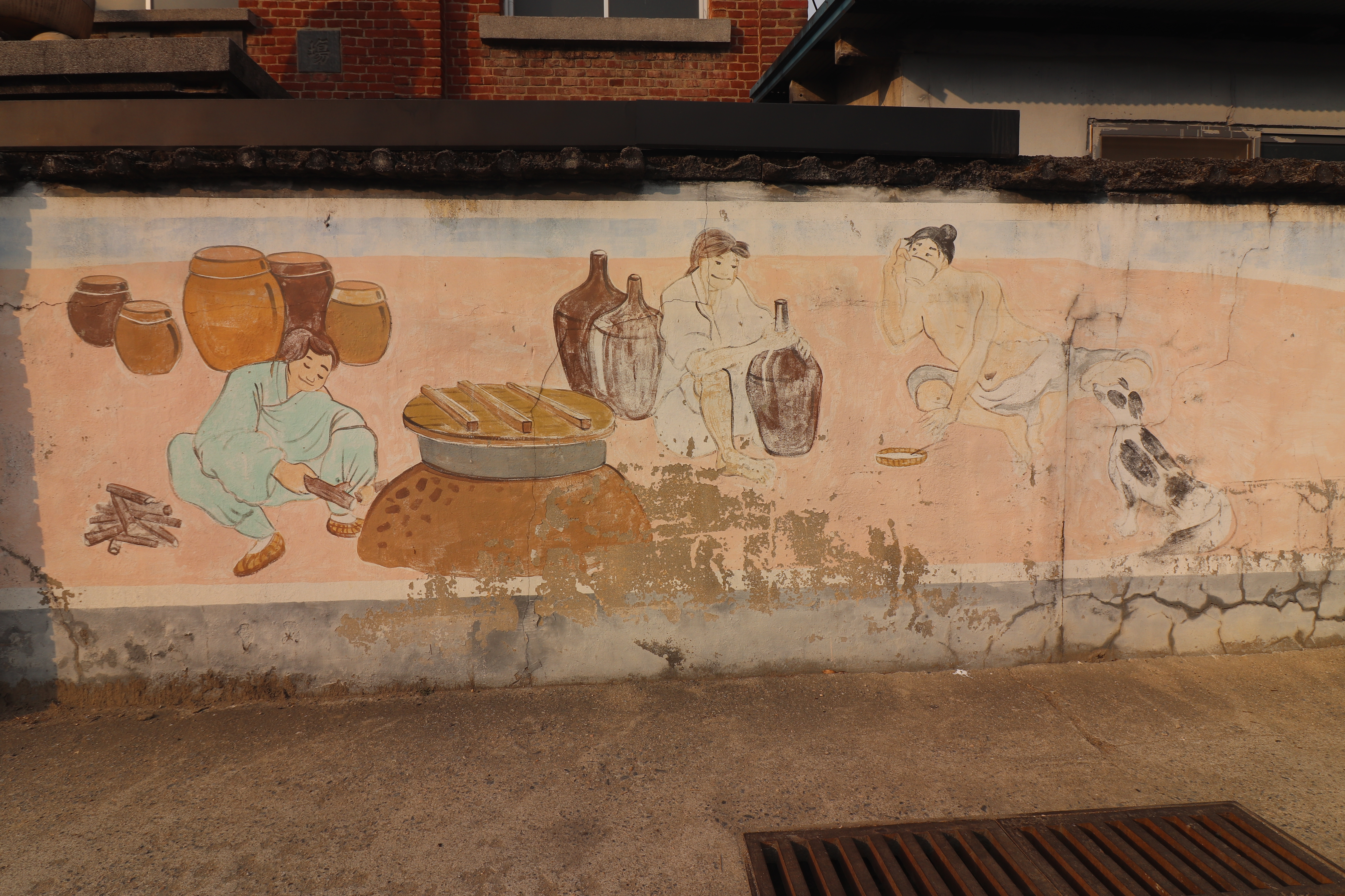 양조장 건물 주변에는 옛스러운 막걸리와 관련된 옛 풍경 그림 벽화들도 볼 수 있었습니다. 커다란 항아리에 막걸리가 가득 담겨 있는 모습, 막걸리를 들고 다니는 사람들의 모습, 옛날 양조장의 모습이나 정겨운 시골 장터의 분위기 등이 담긴 그림들이었어요. 세련된 스타일이라기보다는 투박하고 따뜻한 느낌의 그림체입니다. 이 공간과 딱 맞아 떨어지는 느낌이었습니다.
