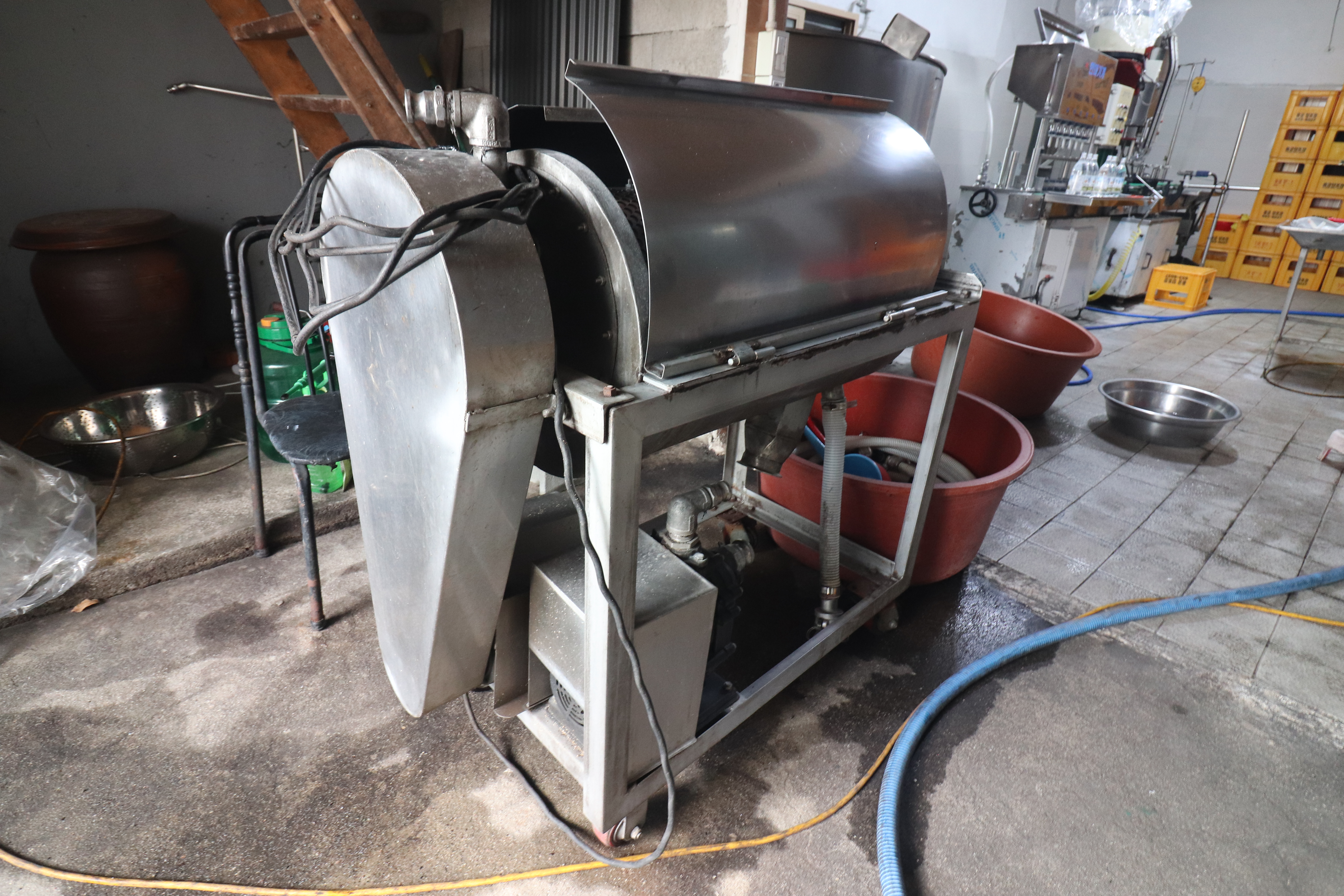 쌀 세척기도 볼 수 있었는데요. 안쪽에 있는 드럼이 회전하면서 물과 함께 쌀을 마찰시켜 불순물을 제거하는 방식입니다. 전통 방식으로는 손으로 일일이 씻었을 텐데, 양조장에서는 이 기계 덕분에 많은 양의 쌀을 빠르고 청결하게 준비할 수 있다고 해요. 생각해보면 막걸리 한 잔이 완성되기까지 이런 수고로운 과정들이 쌓인 거라는 게 새삼 느껴졌습니다.