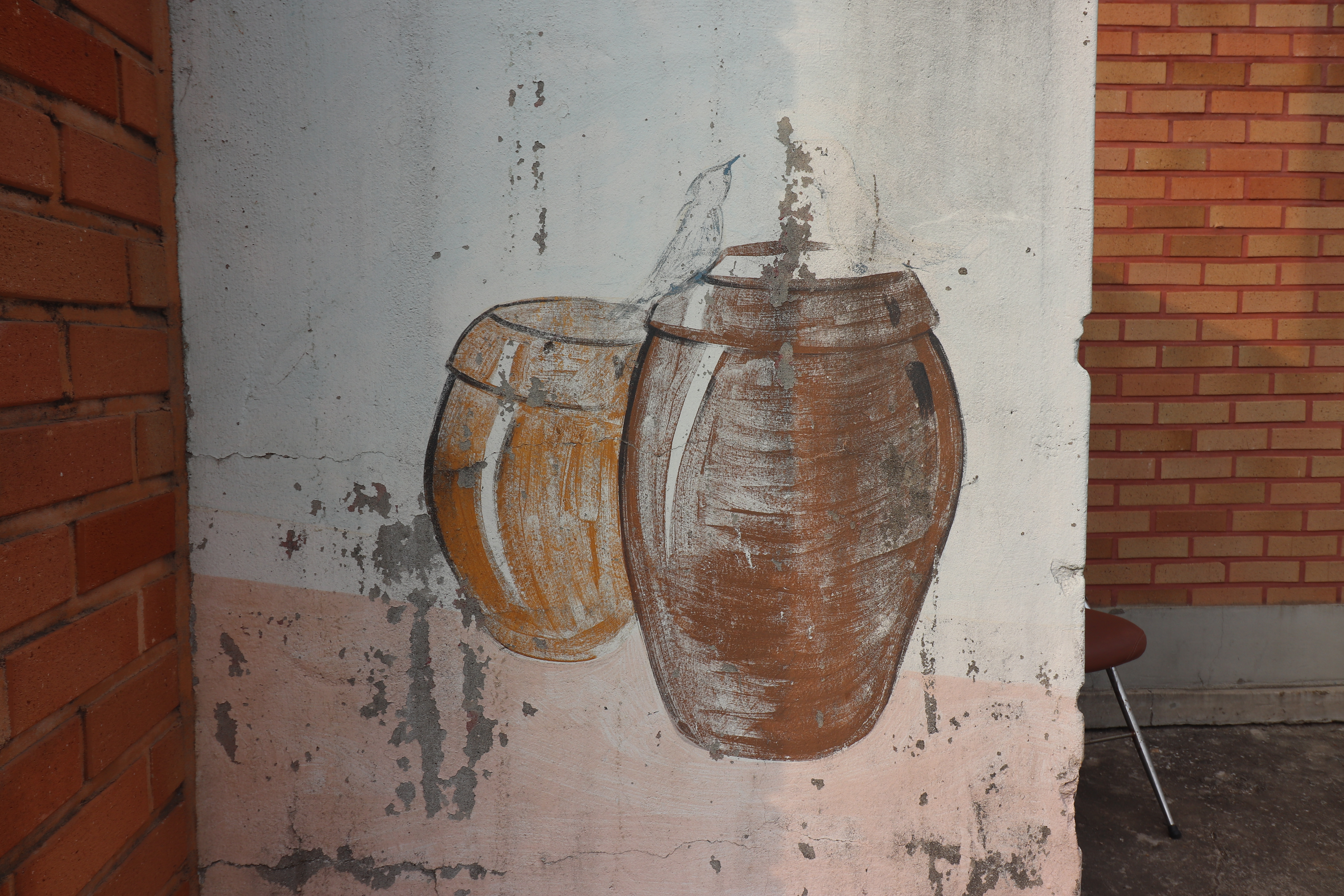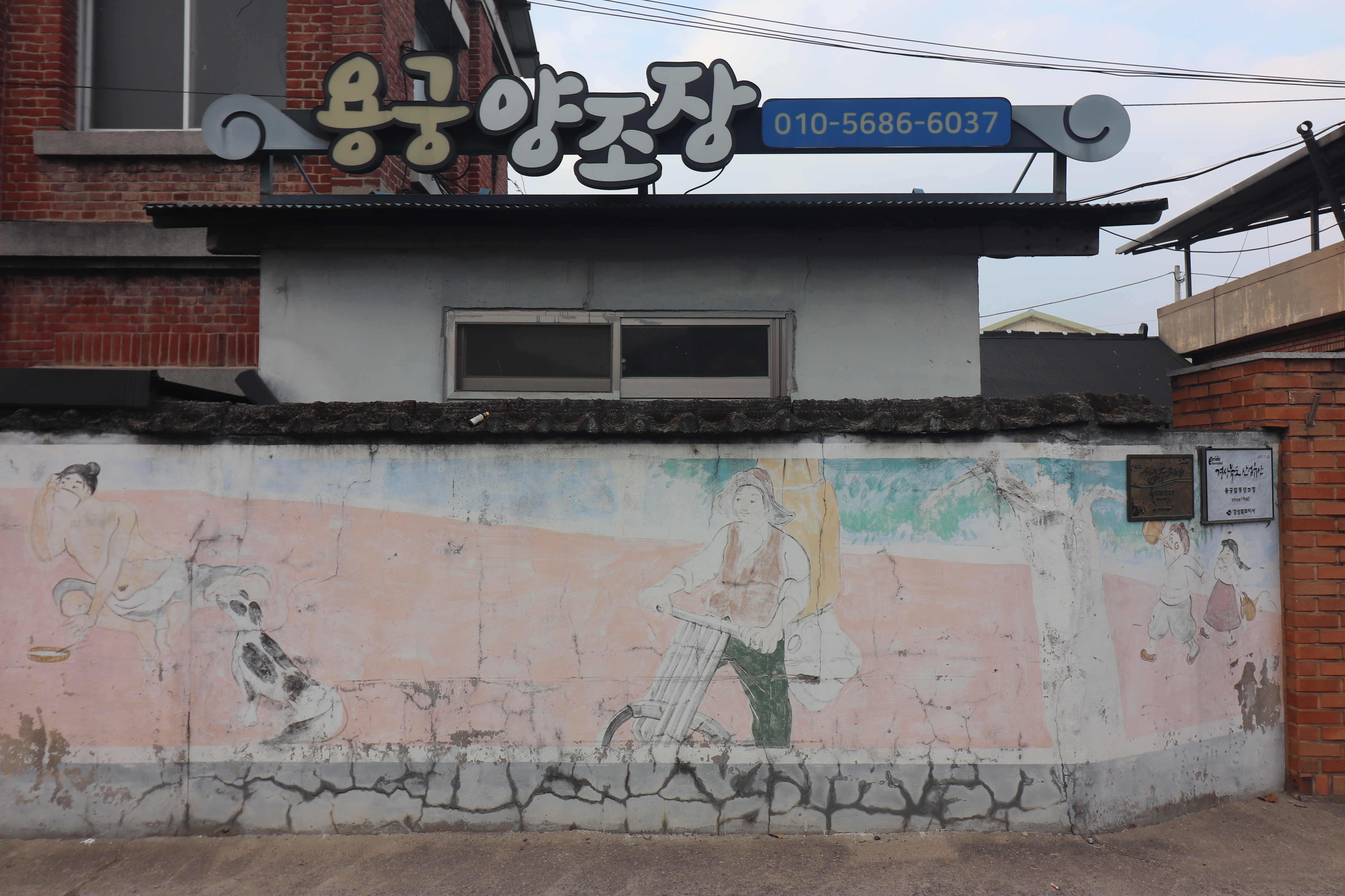 양조장 건물 주변에는 옛스러운 막걸리와 관련된 옛 풍경 그림 벽화들도 볼 수 있었습니다. 커다란 항아리에 막걸리가 가득 담겨 있는 모습, 막걸리를 들고 다니는 사람들의 모습, 옛날 양조장의 모습이나 정겨운 시골 장터의 분위기 등이 담긴 그림들이었어요. 세련된 스타일이라기보다는 투박하고 따뜻한 느낌의 그림체입니다. 이 공간과 딱 맞아 떨어지는 느낌이었습니다.