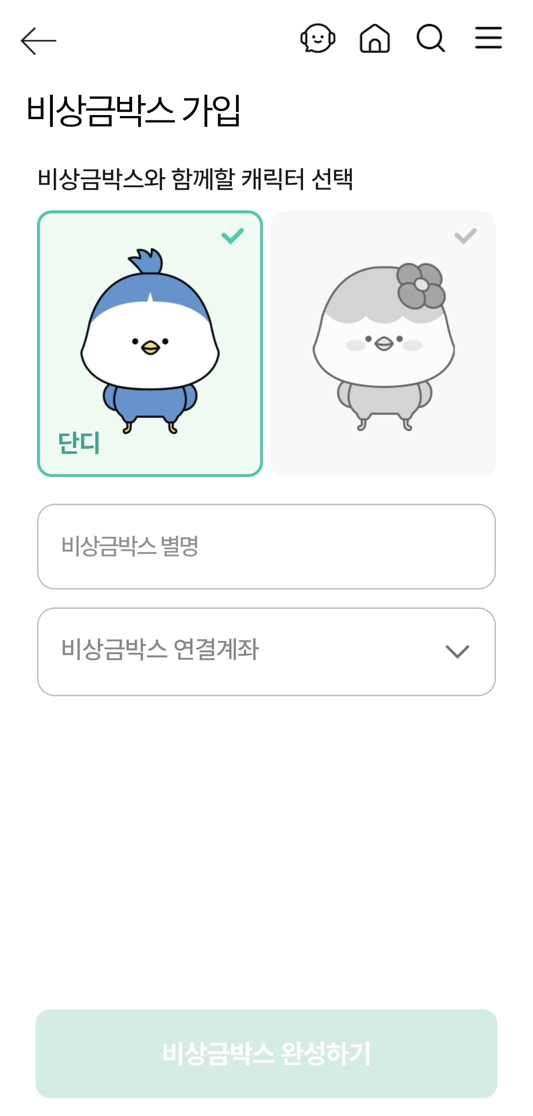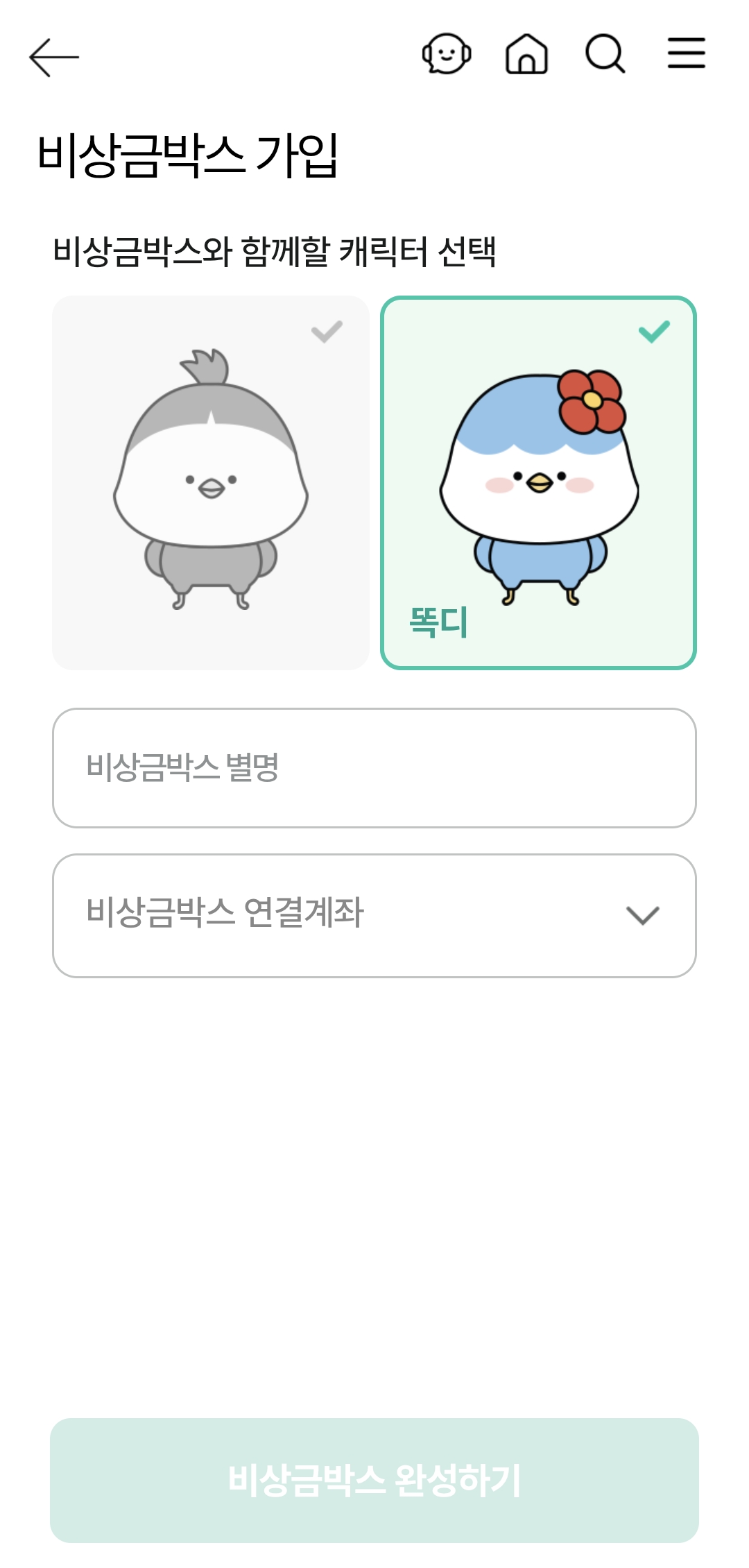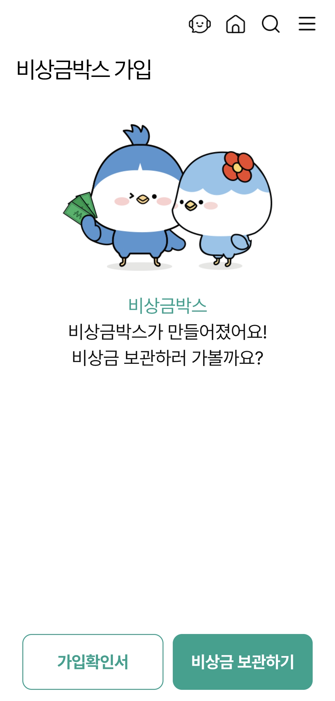가입 후 계좌에 들어가보면 위와 같은 화면을 볼 수 있다. 처음에 돈 넣기 전에는 캐릭터가 `출발`이라고만 말하는데 나중에 돈 절반정도 넣으면 선글라스 쓰는 모습이 나온다.ㅋㅋㅋ 비상금 넣기 버튼을 이용해서 넣을 수 있고, 돈 뺄 때는 꺼내기 버튼을 이용해야한다.