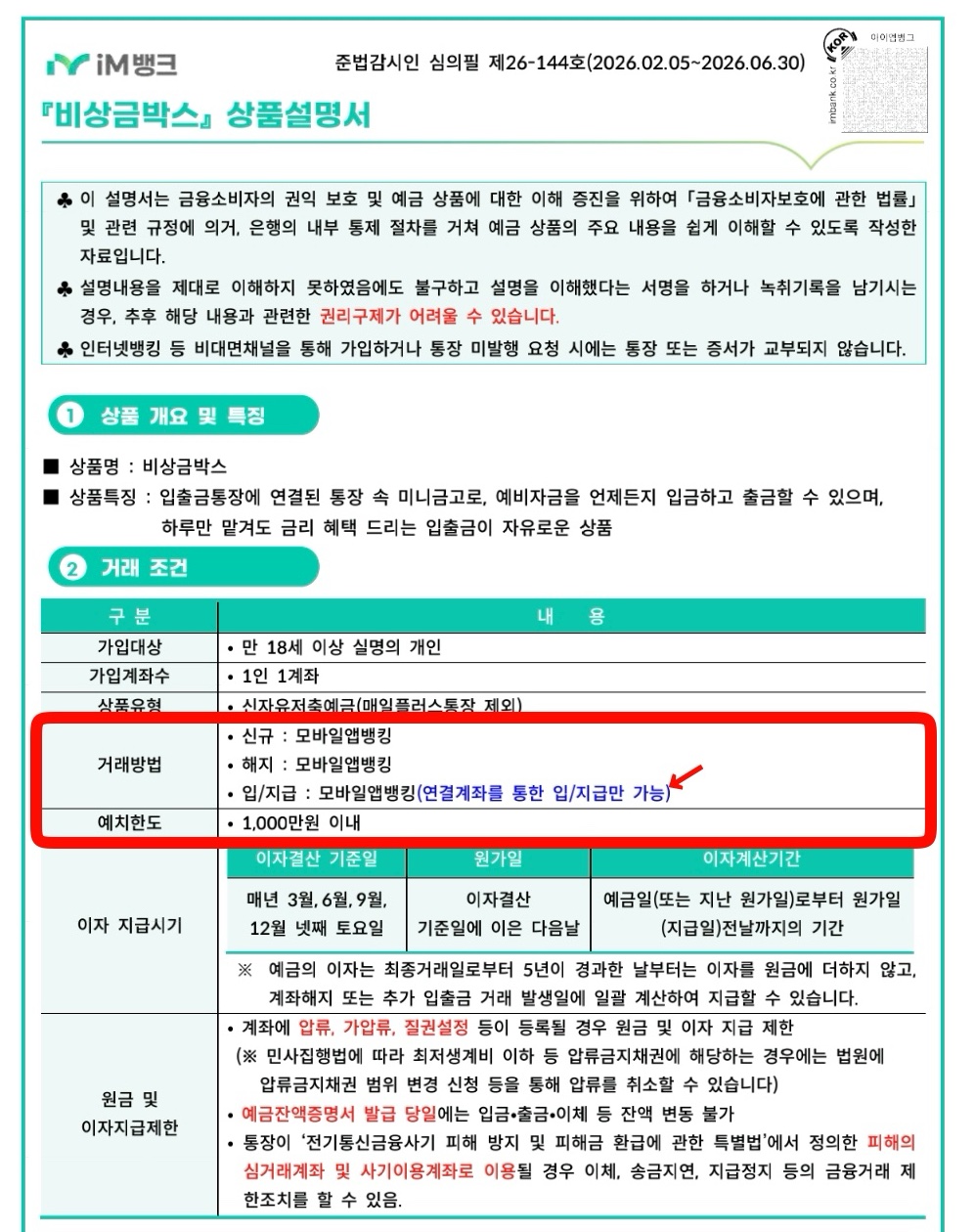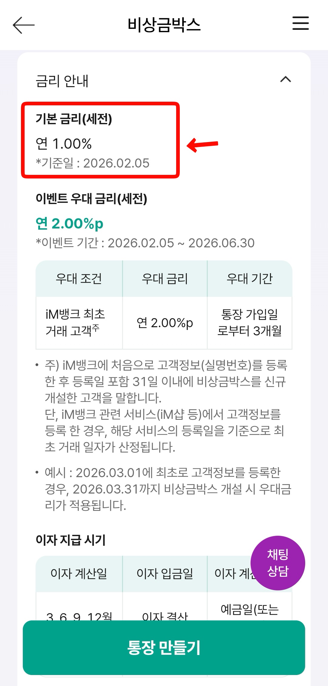 iM뱅크의 연결계좌를 통해서만 입출금이 가능하다는걸 꼭 기억해야한다. 금리는 기본 연 1%이며 이자 지급 시기는 분기별로 넷째주 토요일에 처리한다.
