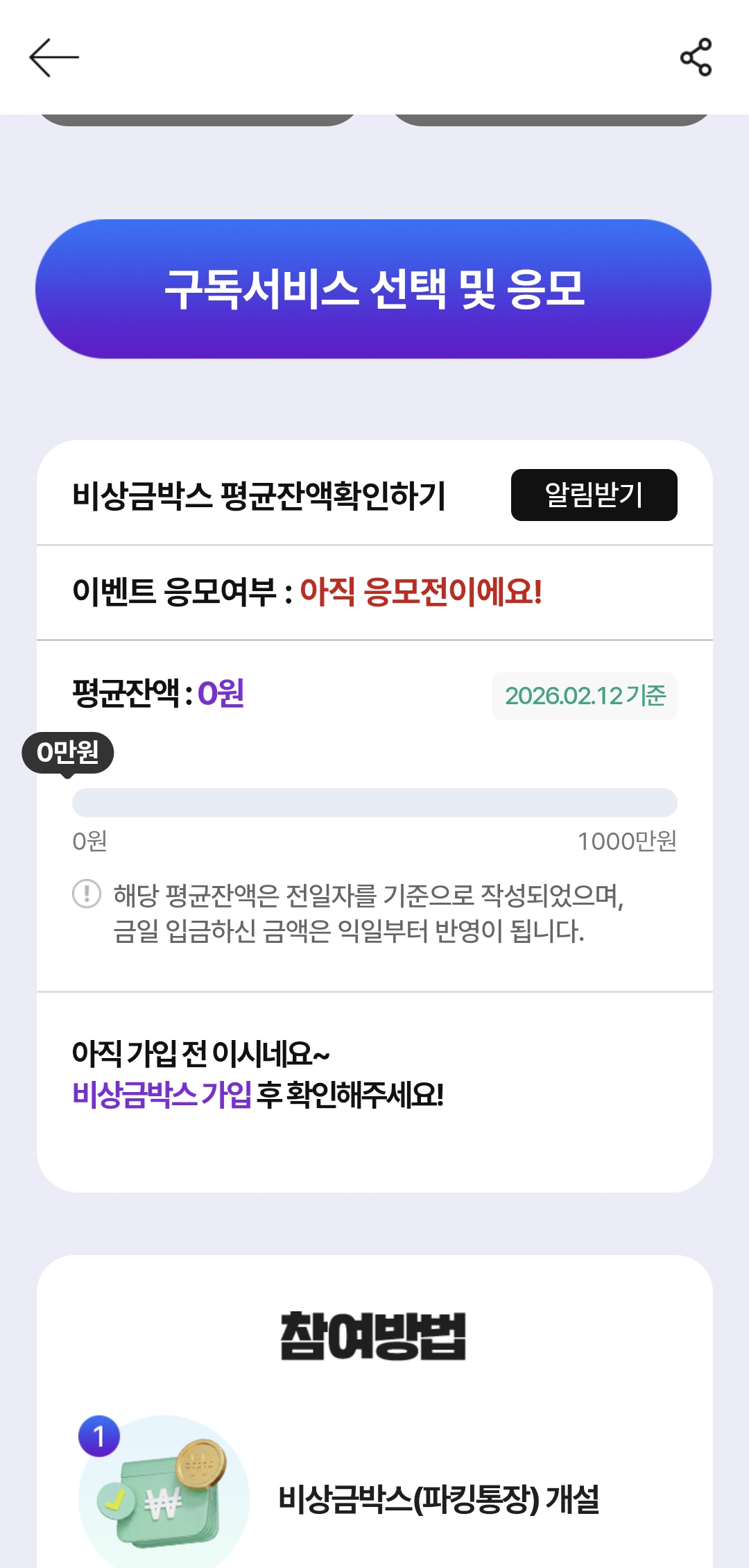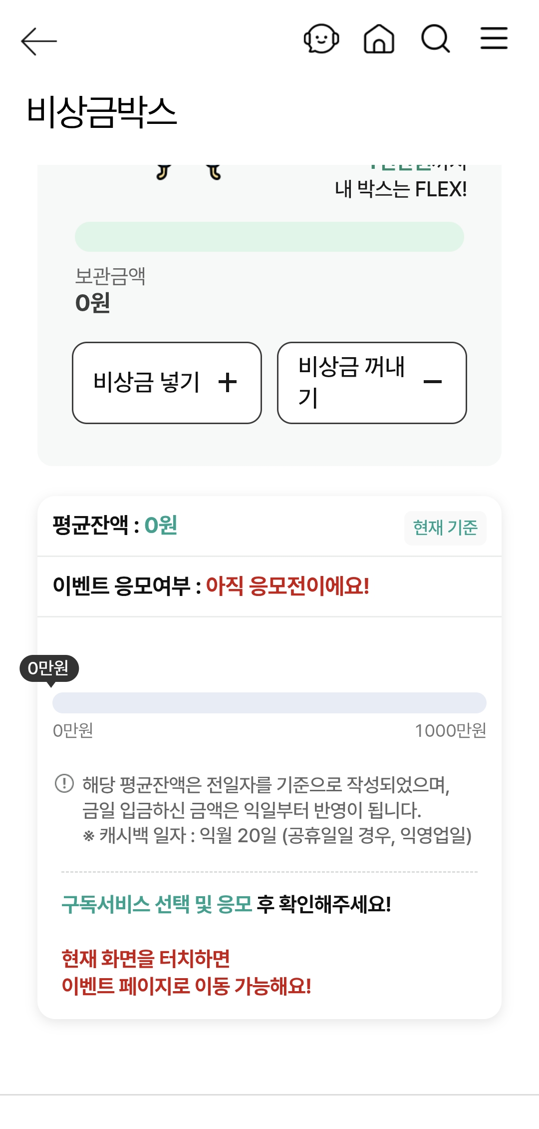 현재 이벤트 중이라서 그런지 iM뱅크 앱 첫화면에서 배너를 볼 수 있었다. 비상금박스 이벤트 페이지를 클릭하면 내용을 볼 수 있다. 아직은 평균잔액이 없고 구독서비스를 선택하지 않아서 금액이 나오지 않는 모습.