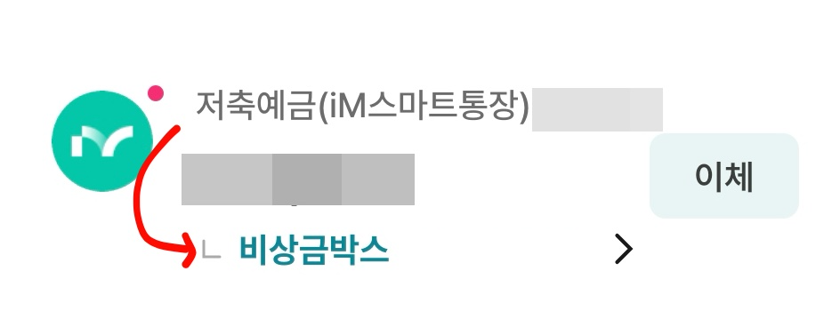 iM뱅크 계좌조회 화면에서는 기존 연결계좌 밑에 비상금박스가 들어가 있는 형식으로 표시된다.