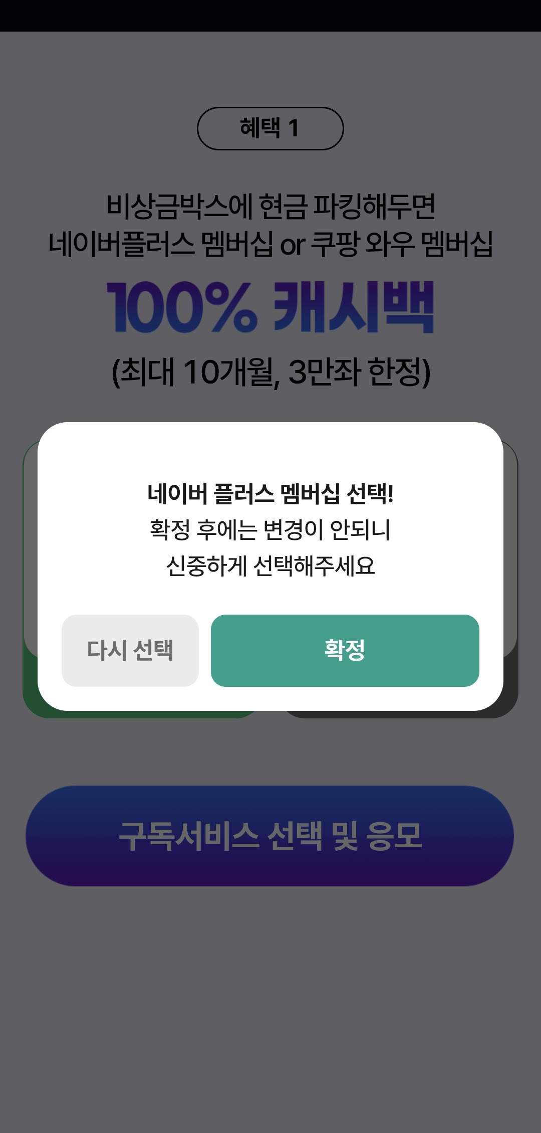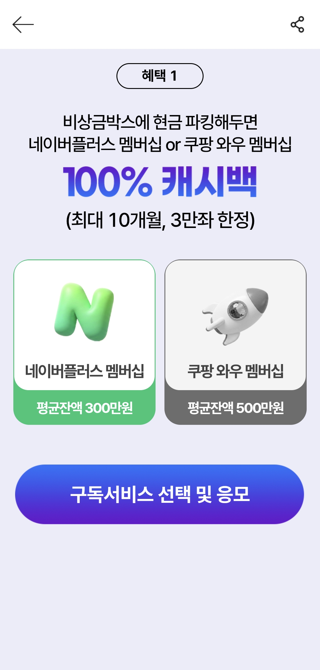 평균잔액 계산을 위해서는 일단 구독서비스를 먼저 선택해야한다. 네이버플러스 멤버십과 쿠팡 와우 멤버십 캐시백에 필요한 평균잔액이 다르기 때문이다. 그래서 네이버플러스 멤버십으로 선택하고 진행한다. 멤버십은 한 번 선택하면 변경이 불가능하다.