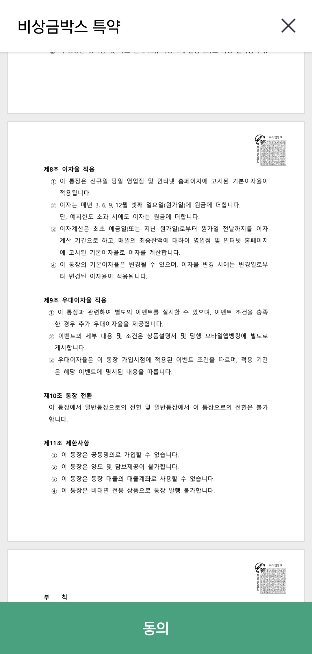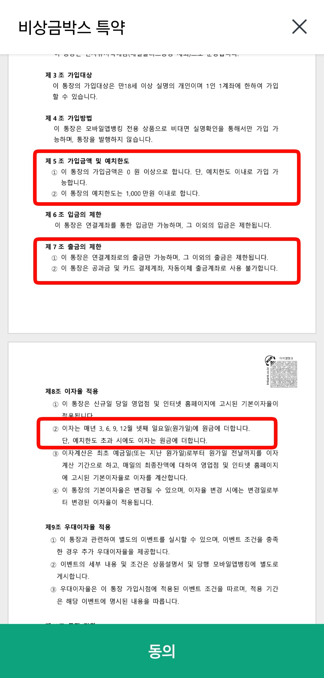 이제 약관은 읽어보자. 보통 사람들은 이런 약관은 잘 안읽어보는데, 나는 되도록이면 간단하게라도 읽어보고 금융상품에 가입하는 편이다. 공과금 결제처로는 해당 계좌를 이용할 수 없다는게 일반 CMA등과는 좀 다르다. 예치한도는 1인당 1000만원까지. 이자는 분기별 지급. 입출금 제한으로 연결계좌로만 돈을 넣고 뺄 수 있다.
