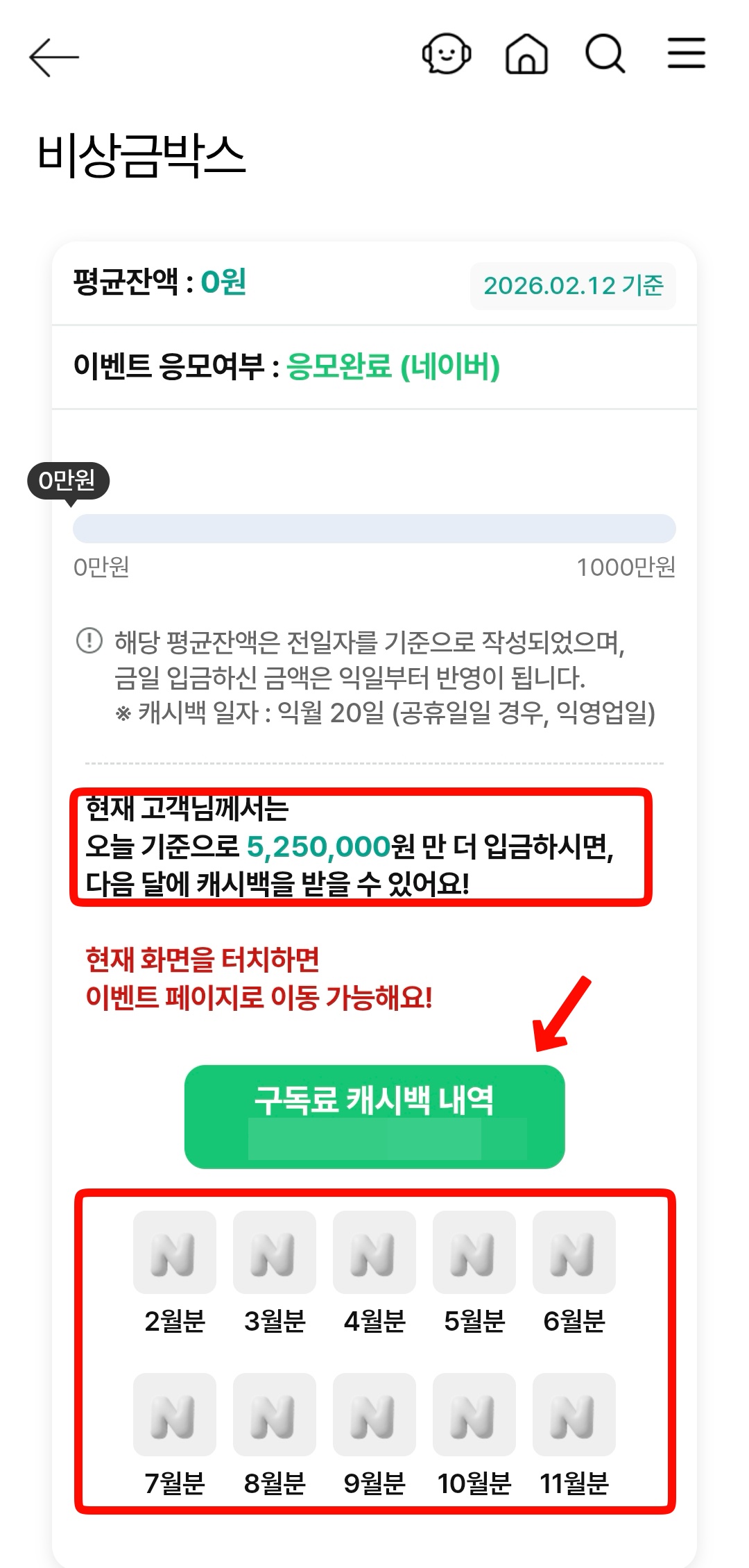 응모 완료하고 이제 비상금을 채워주면 된다. 나의 경우, 오늘 2월 13일 기준으로는 평균잔액 계산이 2월 12일까지로 되어 있고, 2월은 28일까지 밖에 없다보니까 평균잔액이 더 많이 필요하다. 오늘 기준으로 가입할 경우 평균잔액 300만원을 맞춰서 네이버멤버십 캐시백을 받으려면 525만원을 투입해야한다. 그리고 이 금액은 3월 1일부터는 평균잔액 300만원만 맞추면 되니까 차액만큼은 다시 돈을 뺄 생각이다.