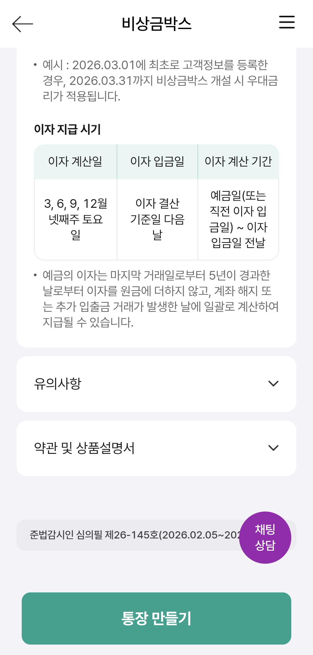 iM뱅크 비상금박스 계좌개설 진행. 금리는 연 1%이며 파킹통장 성격이다. 하루만 맡겨도 이자가 지급된다고 나와있지만, 실제로 이자가 쌓이는것과는 별개로 지급은 분기별로 지급한다. 다른 곳에서는 조회할 수 없는 시크릿 계좌 성격도 갖고 있다.