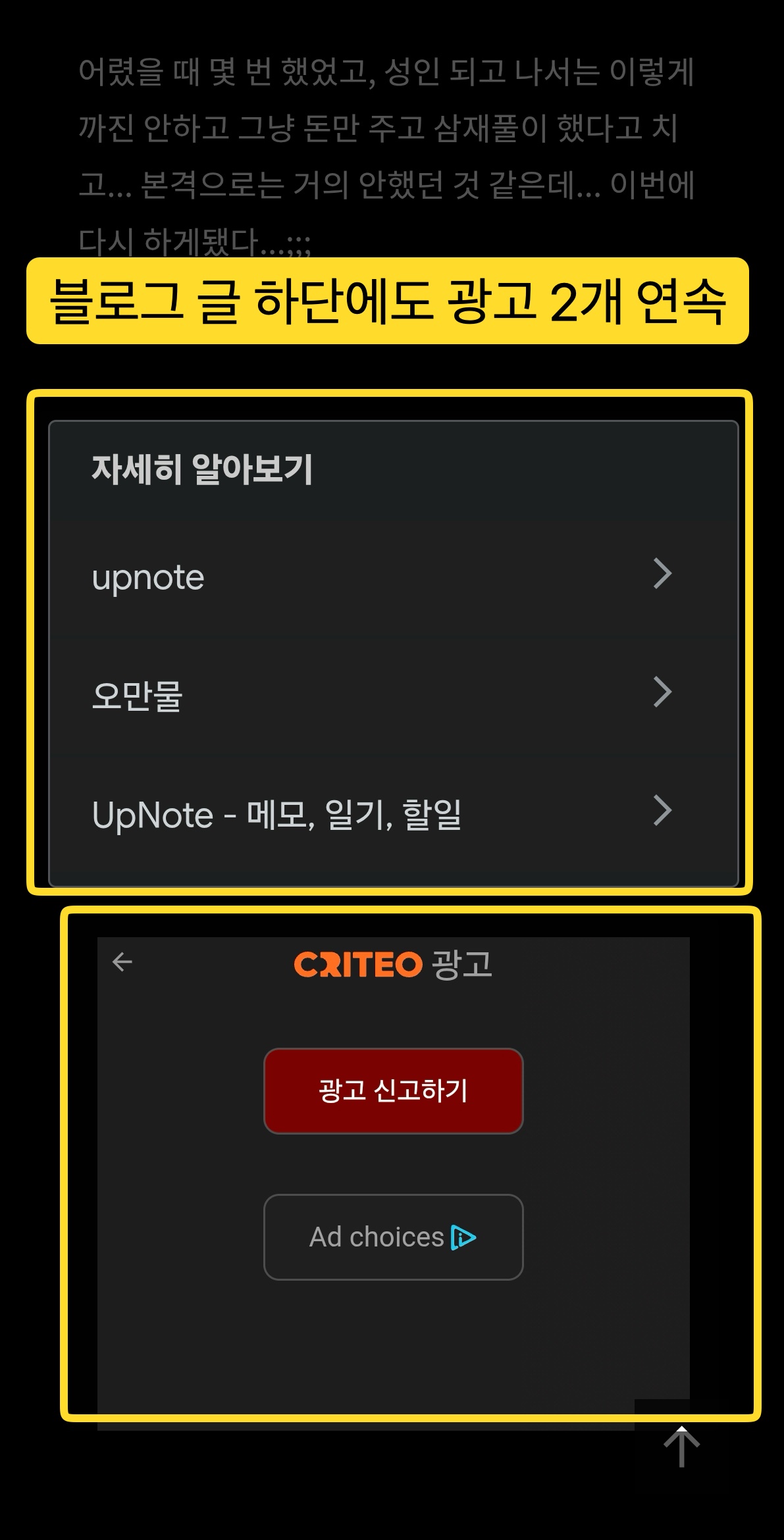 최종적으로 독자들에게 가독성을 제공해서 저의 콘텐츠를 노출하는게 가장 큰 혜택이자 기쁨이 된다는걸 몇년간 잊고 있었던 것 같습니다. 실제로 짝꿍에게 물어보니 네이버블로그로 옮겨진 이후 "글 읽기가 이전보다 훨씬 더 편하다" "느좋이다" 등의 피드백을 해주었습니다. 이렇게 된 근본적인 원인이 티스토리에서 강제로 추가해버리는데다가 위치 조정조차 할 수 없는 광고들 때문입니다.