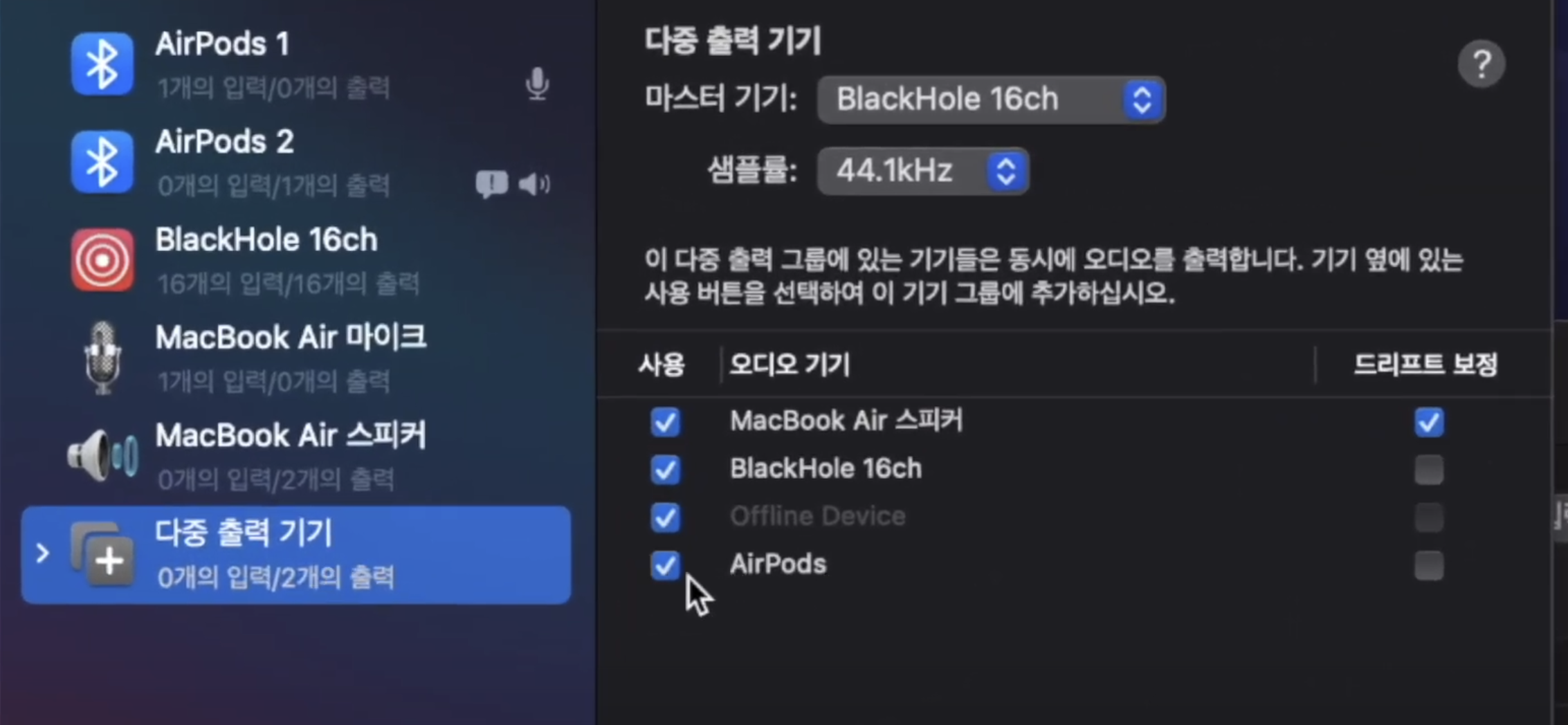 지난번에 만들었던 다중출력기기에서 에어팟이 추가된 모습을 확인합니다. 여기에서 사용에 체크해줍니다.
