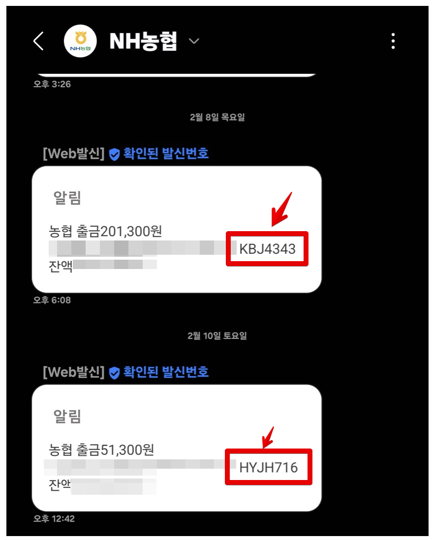 일단 출금은 비밀번호를 알고 있어야만 출금을 할 수 있거든요. 위에 표시된 KBJ 어쩌고... HYJH 어쩌고... 이 문자가 편의점 ATM기의 그 기계 이름과 번호입니다.