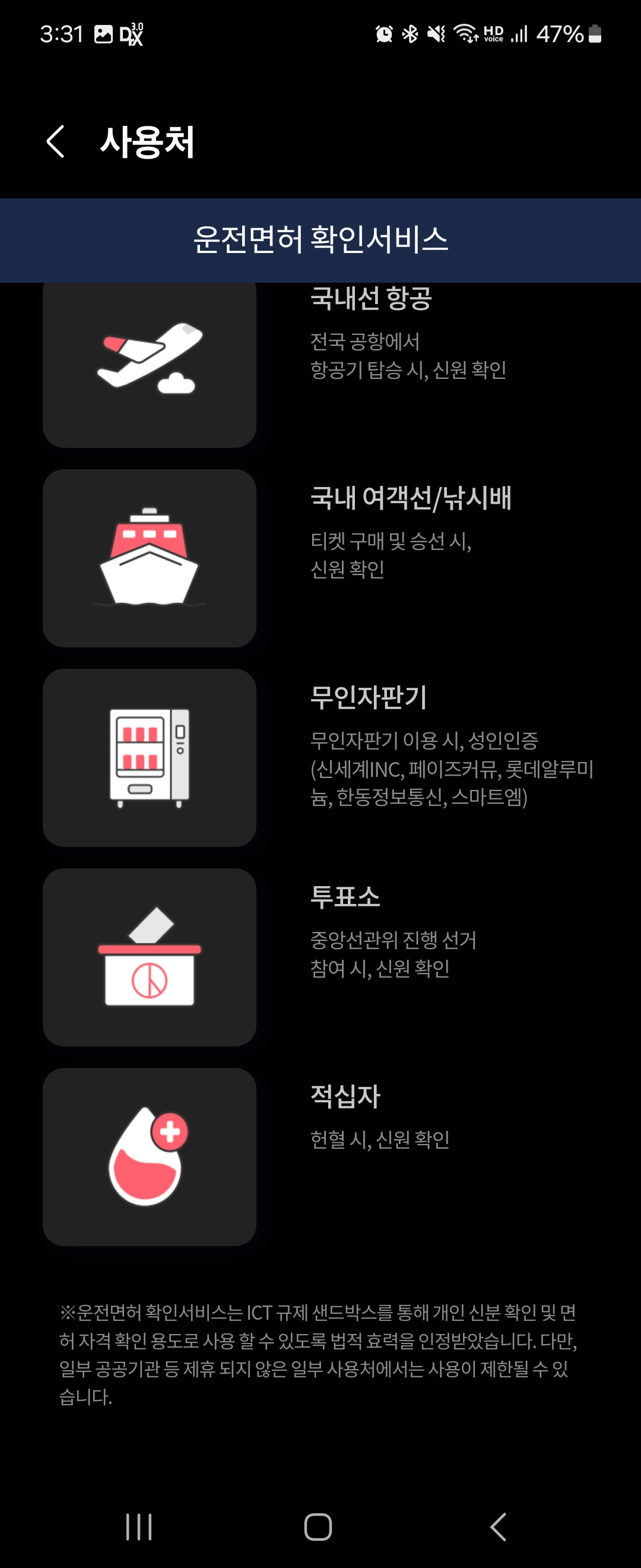 현재 삼성페이, 그러니까 삼성 월렛에 들어가보면 이미 운전면허 확인서비스는 예전부터 계속 진행이 되고 있는 서비스입니다. 이 서비스는 통신사 PASS앱을 연동해서 사용하는 방식인데 ICT 규제 샌드박스를 통해 개인신분 확인 및 면허 자격 확인 용도로 사용할 수 있도록 법적 효력을 인정받았다고 안내되어 있습니다. 하지만 뒤에 보면, 일부 공공기관 등 제휴되지 않은 일부 사용처에서 사용이 제한될 수 있다고 안내하고 있습니다.