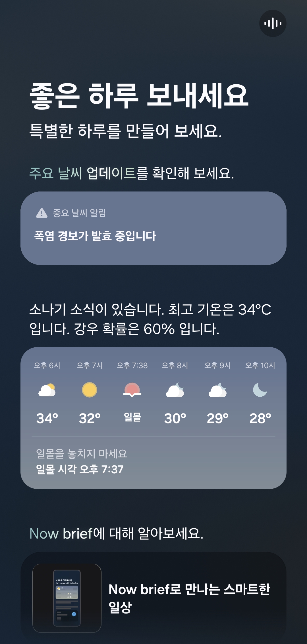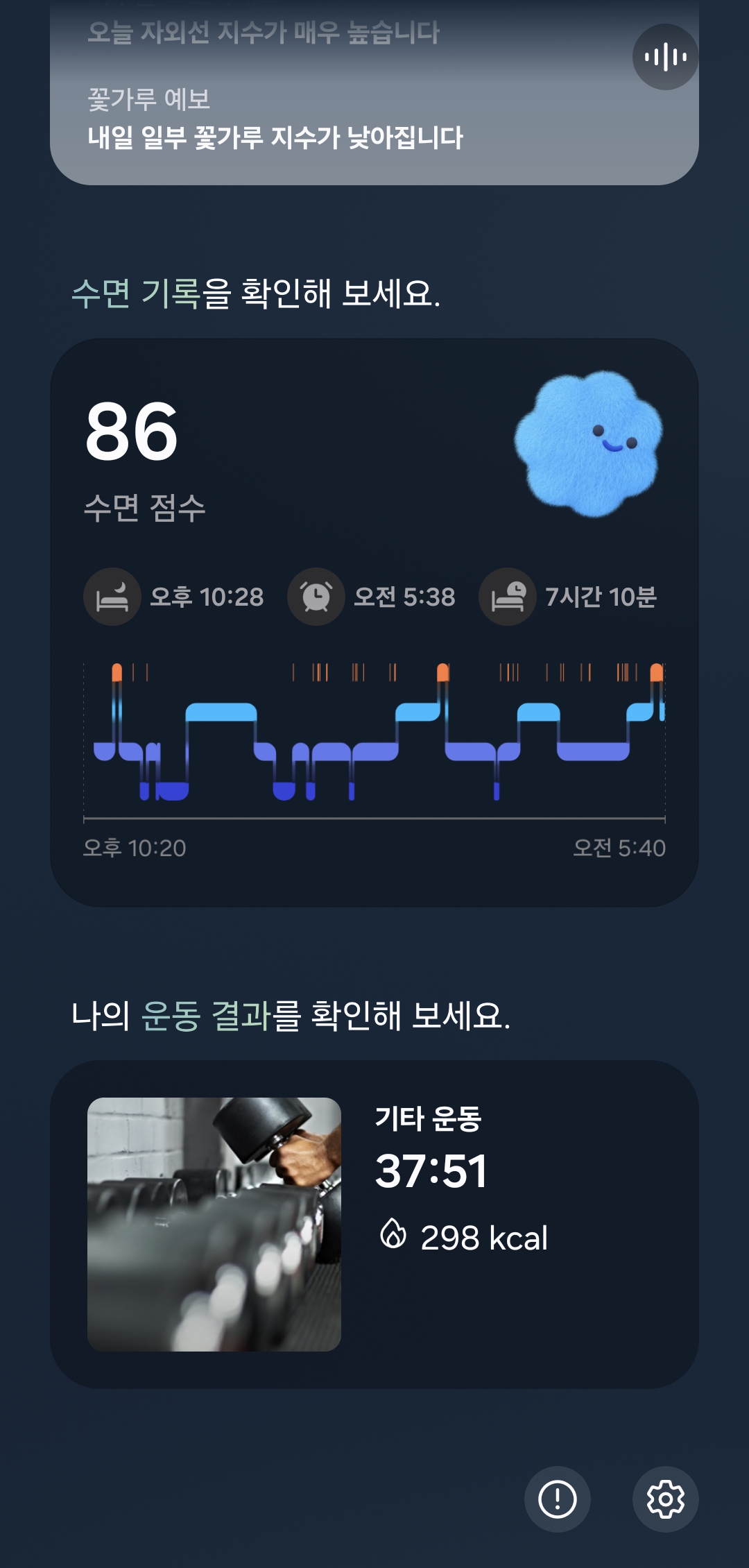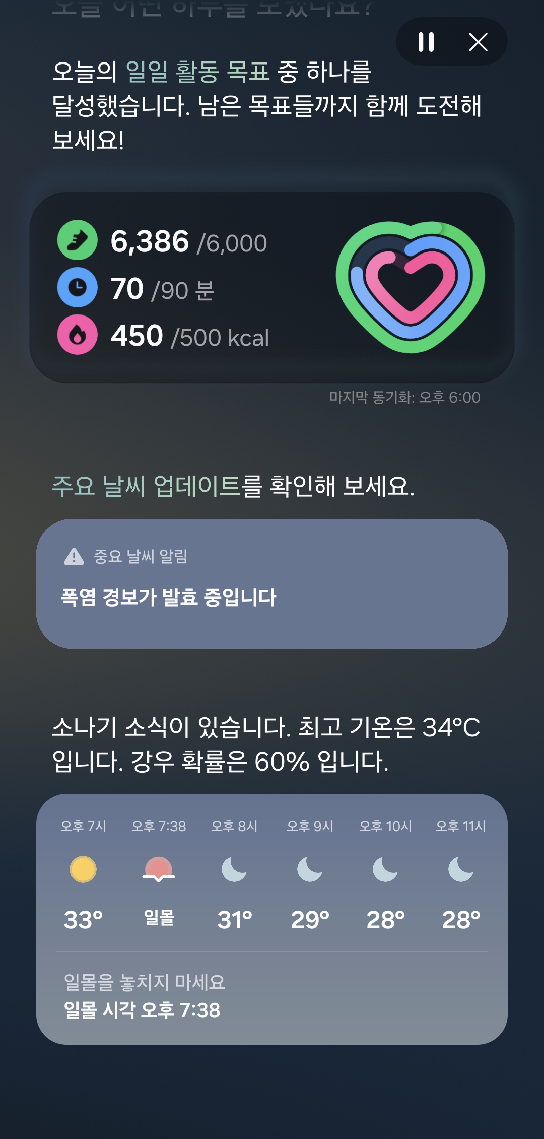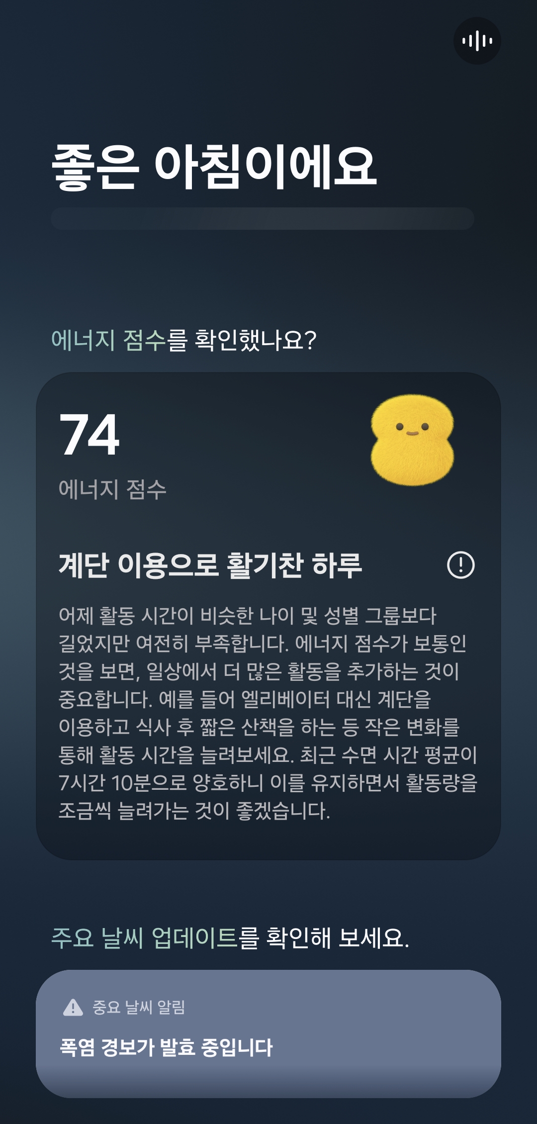 일과 중이나 오전 오후의 경우 특별한 내용은 없고 주요 날씨라던가 일일 활동 목표 등을 안내해준다. 일일 활동 목표는 나는 별로 신경쓰지 않고 있고 날씨는 꽤 관심사라서 날씨를 브리핑 받는건 유용해보였다.
