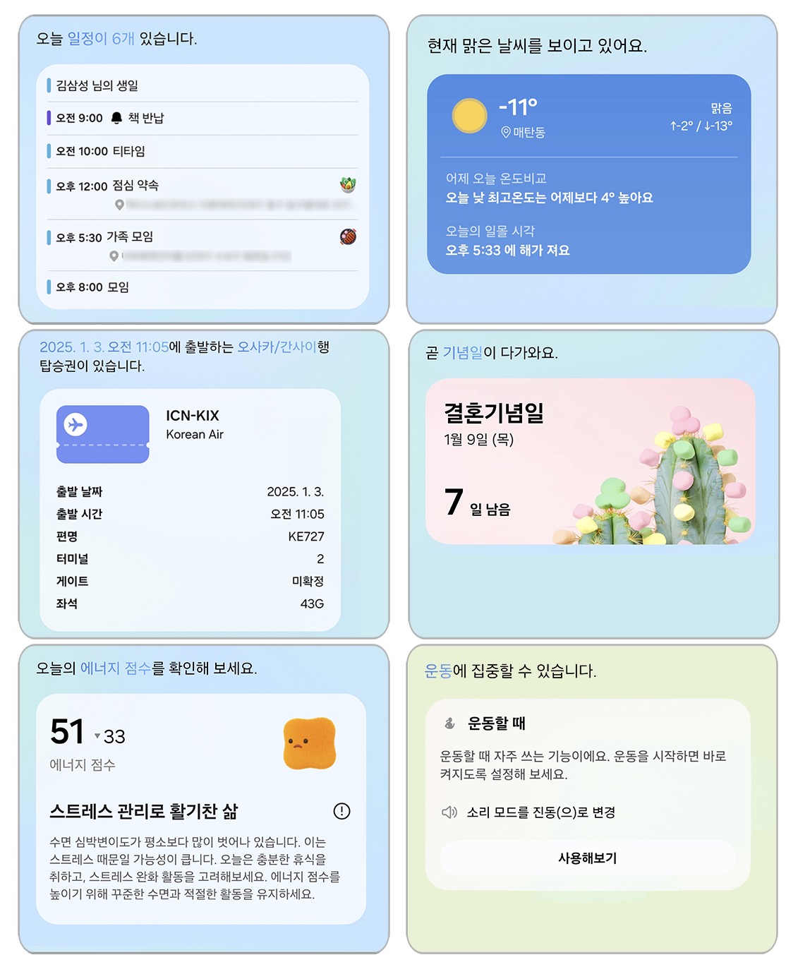 삼성전자 홈페이지에 있는 가이드라인에서 내용을 보게되면 일정이나 날씨, 여행쪽, 기념일이나 캘린더쪽, 에너지 점수, 운동할 때 등의 루틴 등을 이용하는 방법으로 활용할 수 있는 듯 하다. 그런데 각 항목에 대한 자세한 활용법과 연동법은 나와있지 않아서 조금 헷갈린다.