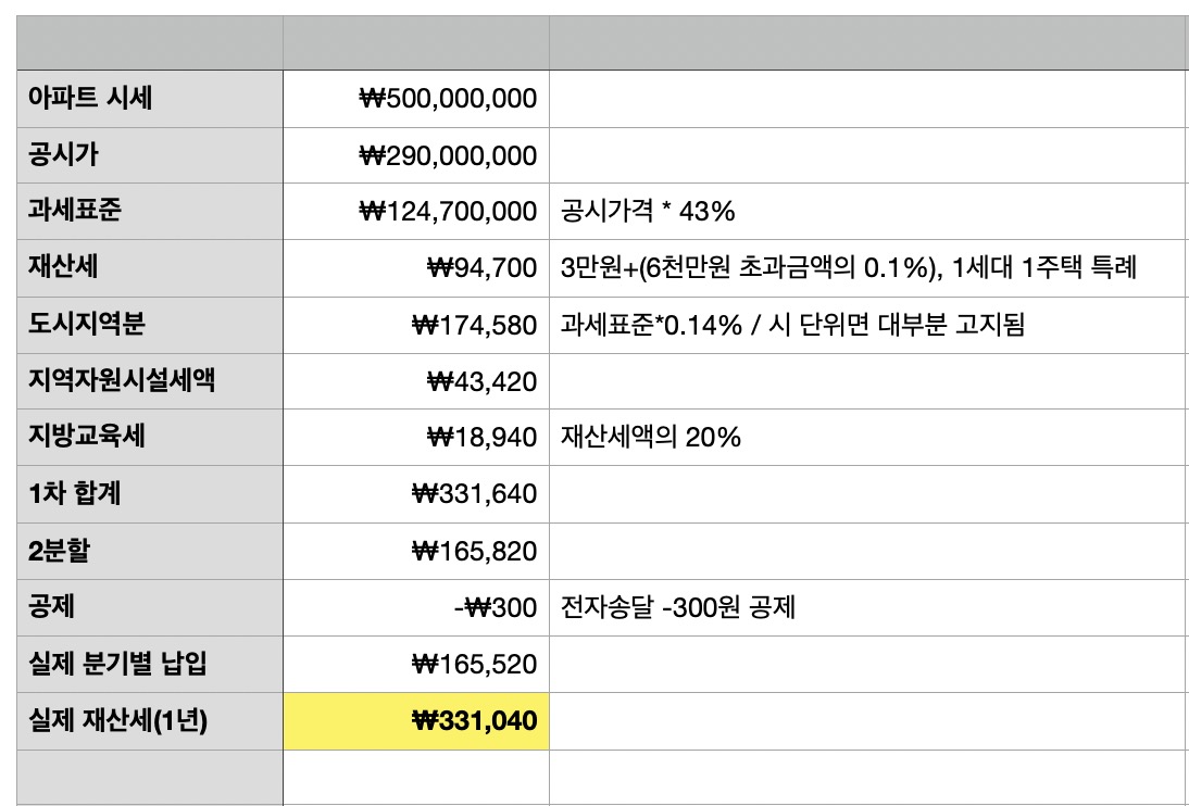아래와 같이 스프레드시트로 정리해서 계산해보았다. 아파트 가격 5억원, 공시가 2억 9천 기준이다. 아파트 시세가 5억원이라면 공시가격은 대략 3억원쯤 된다.