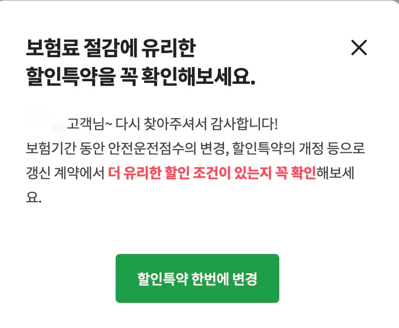 이번에 DB손해보험 다이렉트 자동차보험에서 갱신 과정에서 바뀐점이 위 이미지다. 보험료 절감에 유리한 할인특약을 자동으로 변경해주는 기능이 생겼고 특약할인을 한번에 조회하는 기능이 추가되었다.