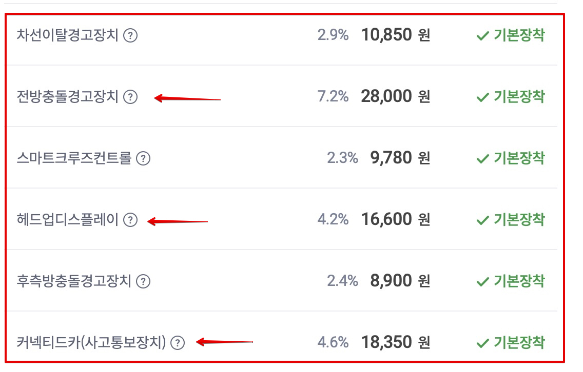 블랙박스 할인특약은 원래 있는거고... 차량운행 안전장치 특약할인 이 부분도 꼭 챙겨야하는 할인이다. 스마트 크루즈 컨트롤도 특약 할인해준다.