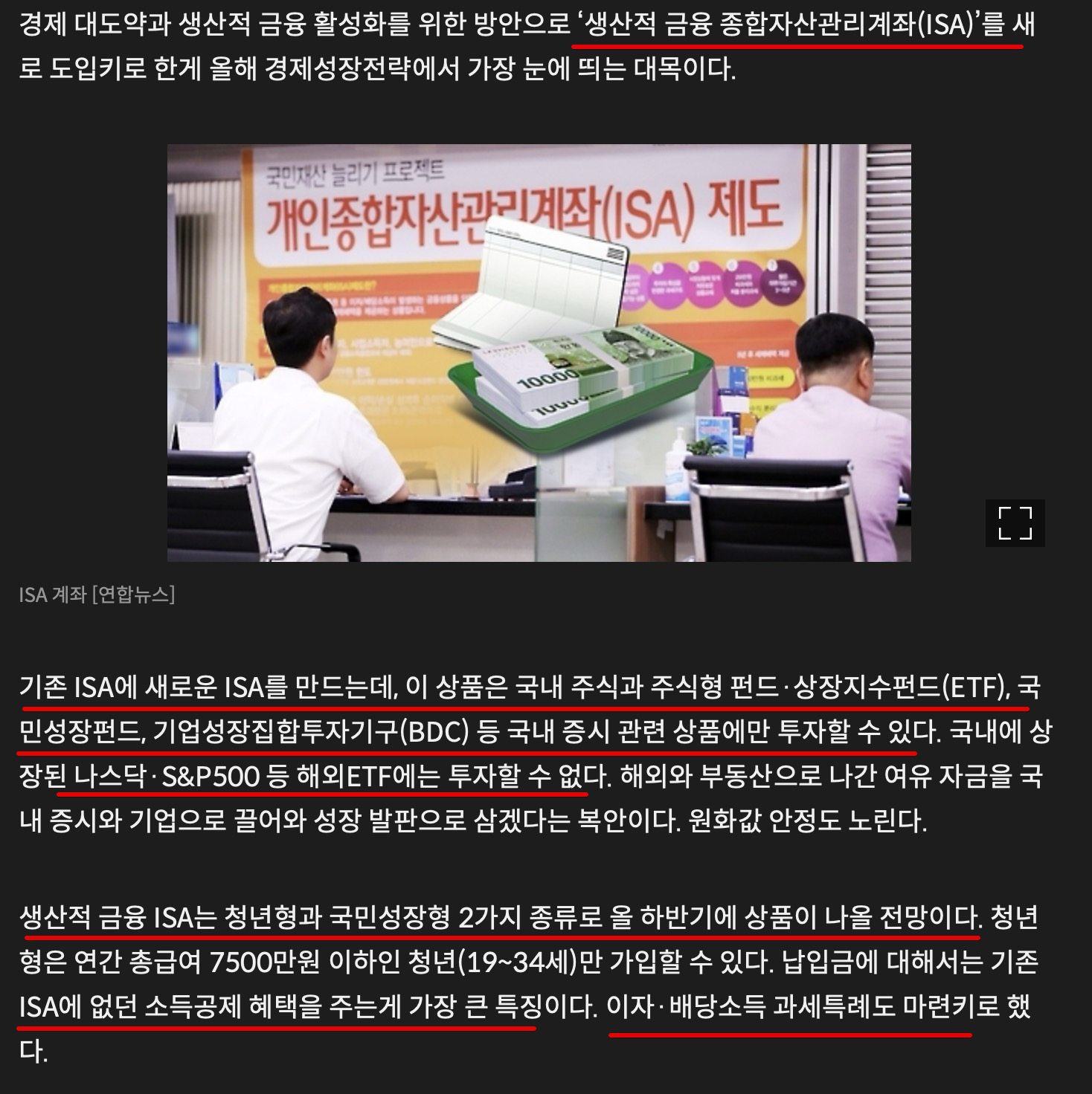 원래 작년인가? 까지만 하더라도 기존 ISA 계좌를 조금 더 개선해서 세법개정안에 담아서 발표하기로 되어있었다. 투자한도를 2배 늘려주고 비과세 혜택도 2배 늘려주는 ISA로 개선될 예정이었다. 그런데 지금 생산적 금융 ISA가 나온다고하니까 이런 개정은 무산된 모양이다.